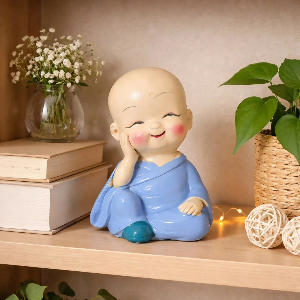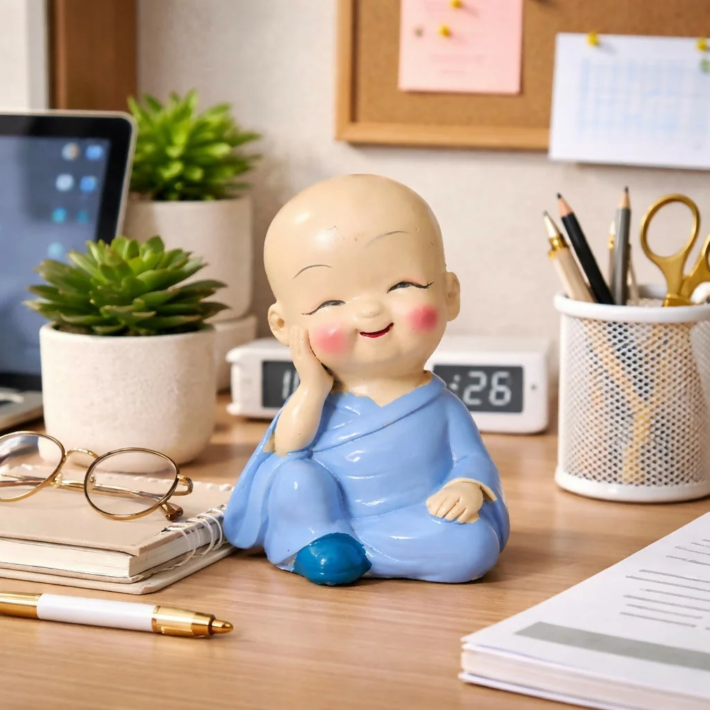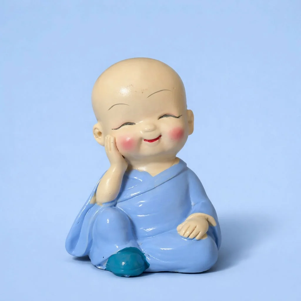 monk showpiece, baby buddha statue, cute monk figurine, desk decor item, small buddha idol, home decoration item, office desk decor, smiling monk statue, gift showpiece, decorative figurine, miniature statue, spiritual decor, shelf decoration item