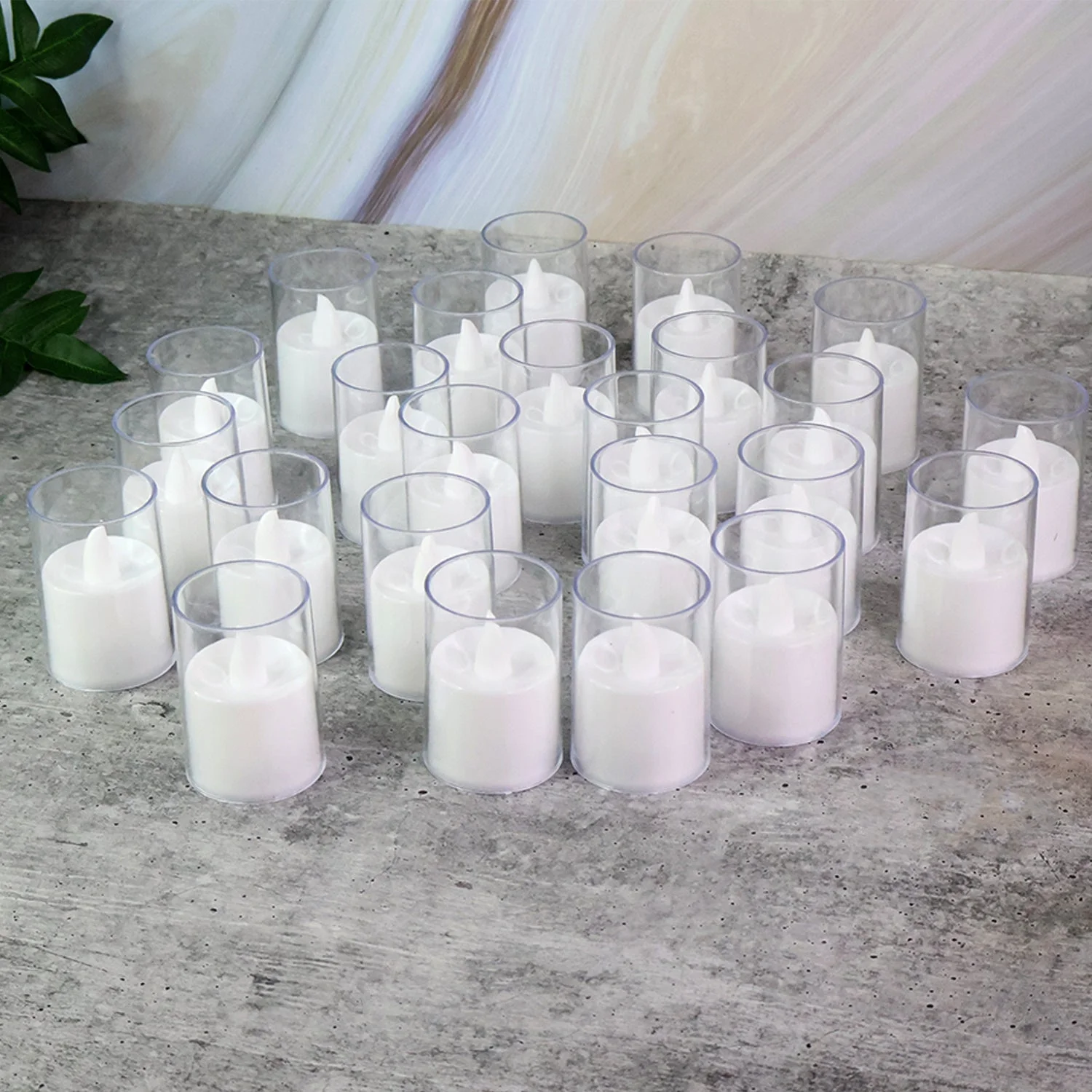 Set of 24 flameless LED tealight candles with transparent glass covers.