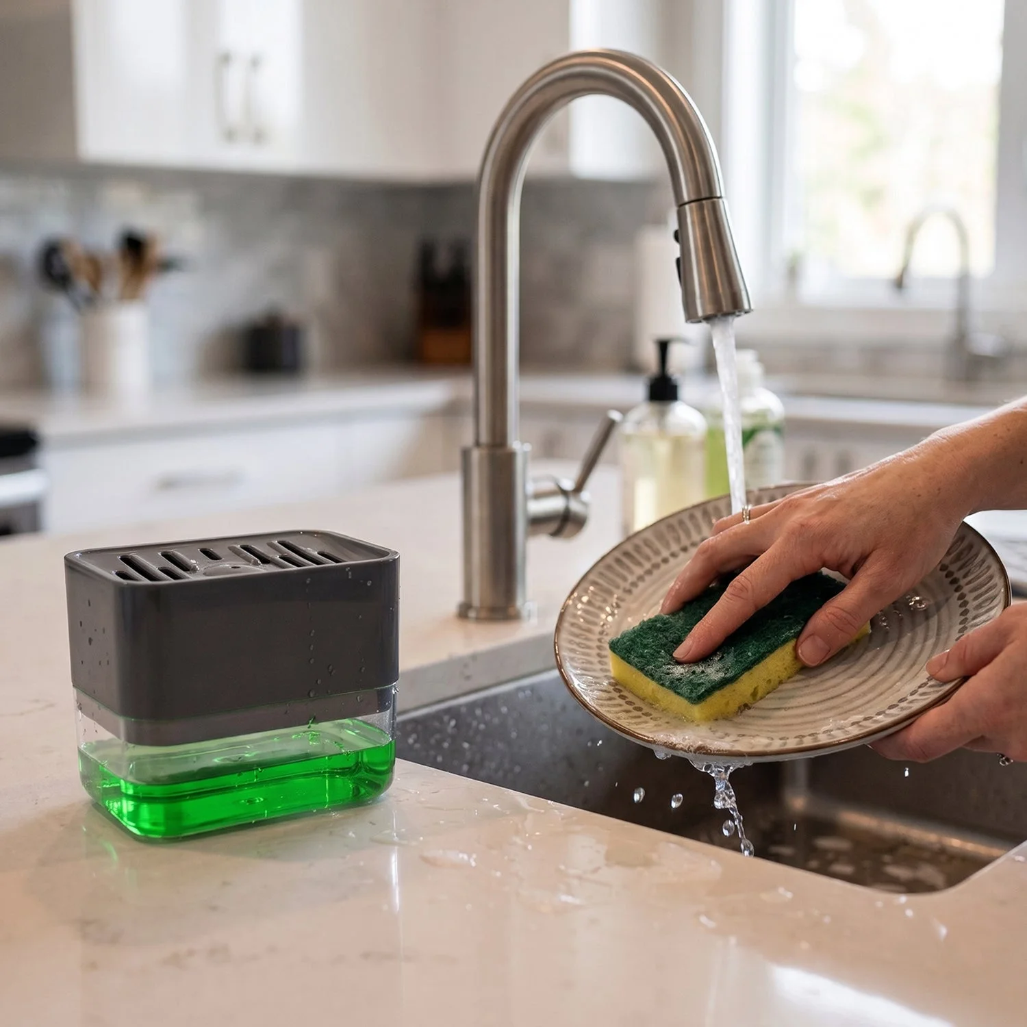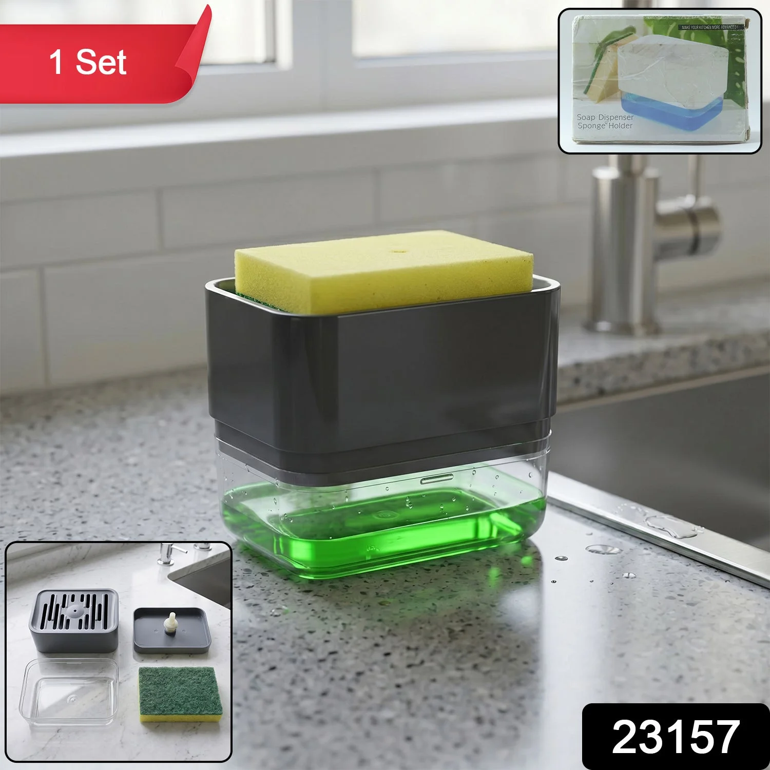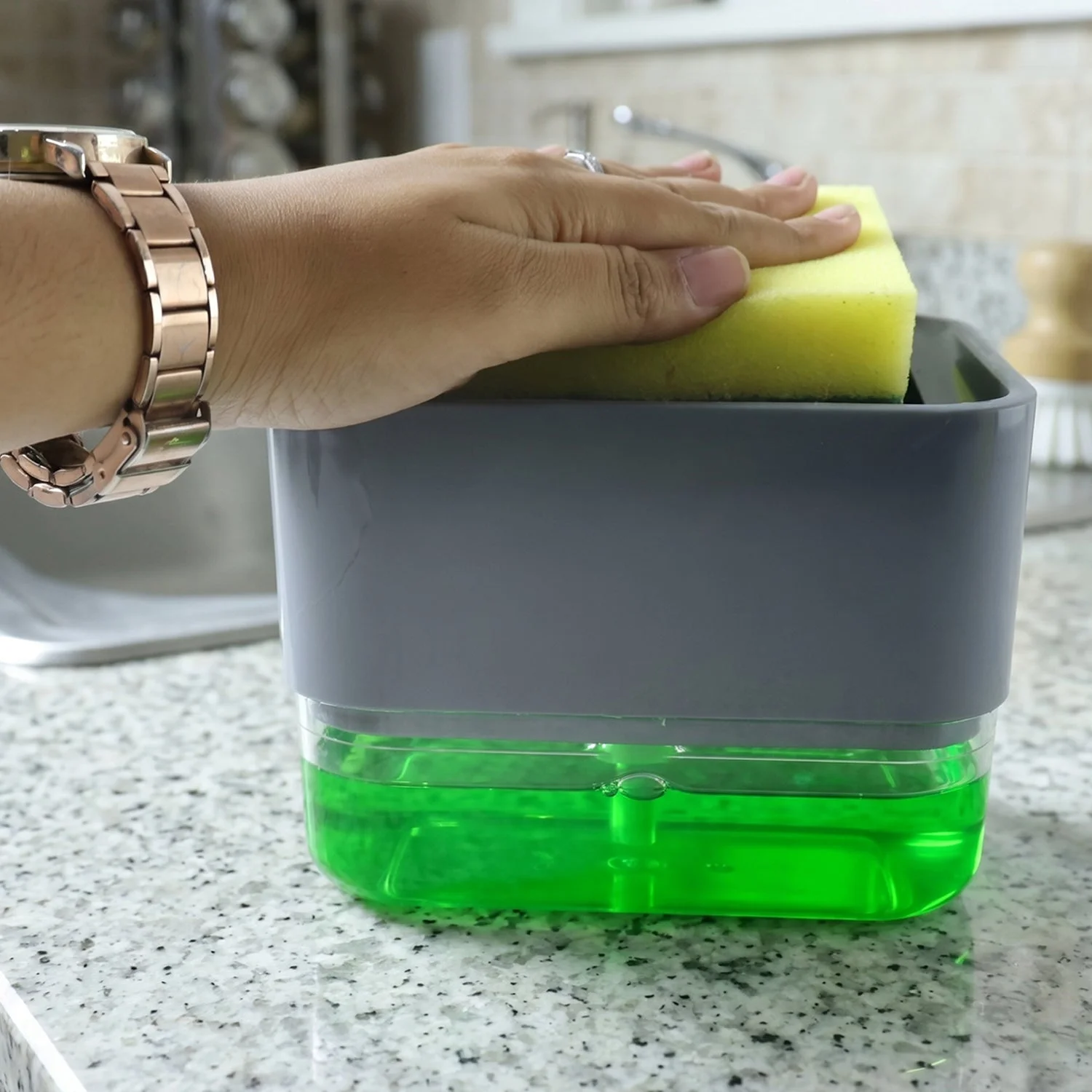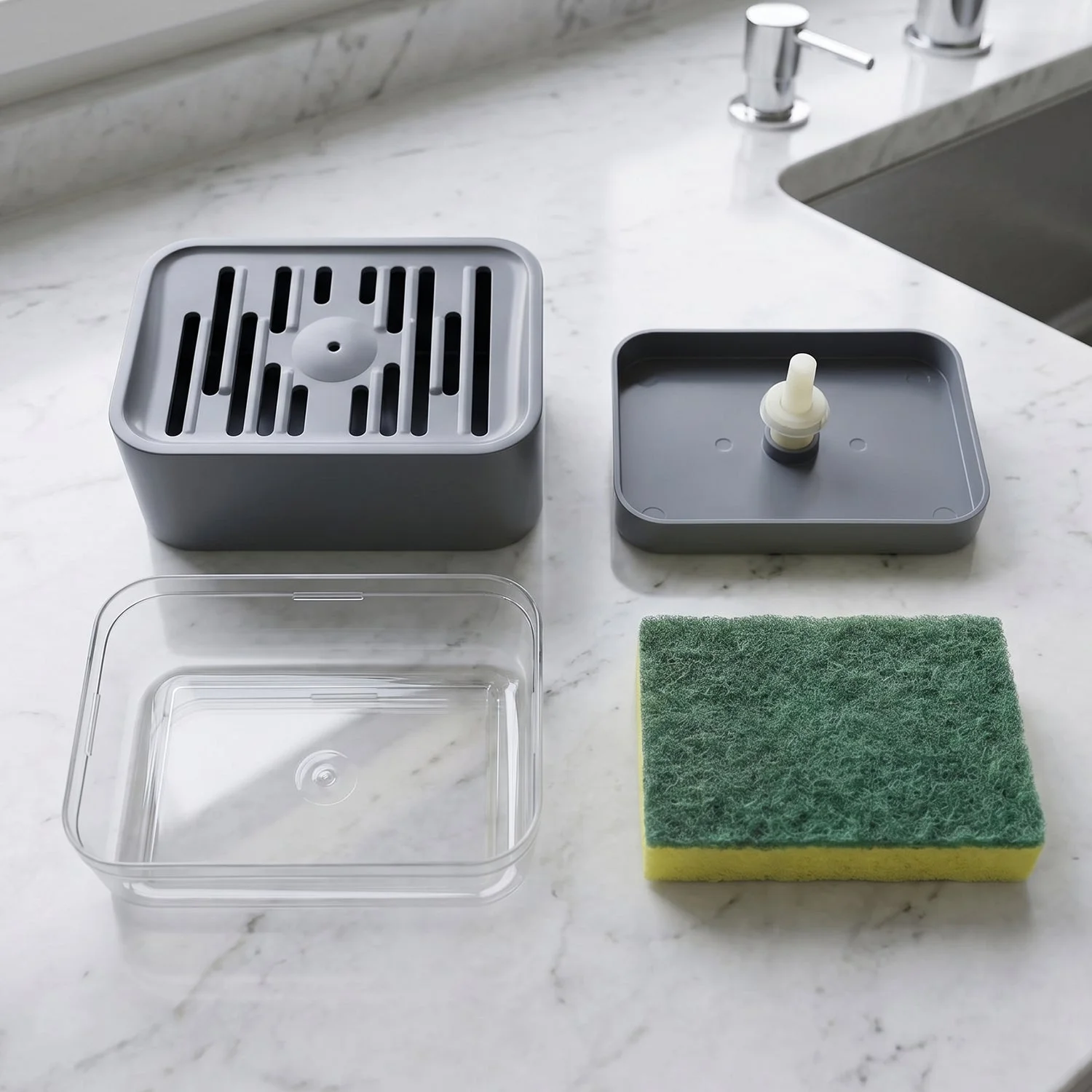 Keep your sink area organized with this practical soap dispenser set. This kitchen soap dispenser comes with a built-in sponge holder, making it a perfect sink organizer for daily cleaning needs.