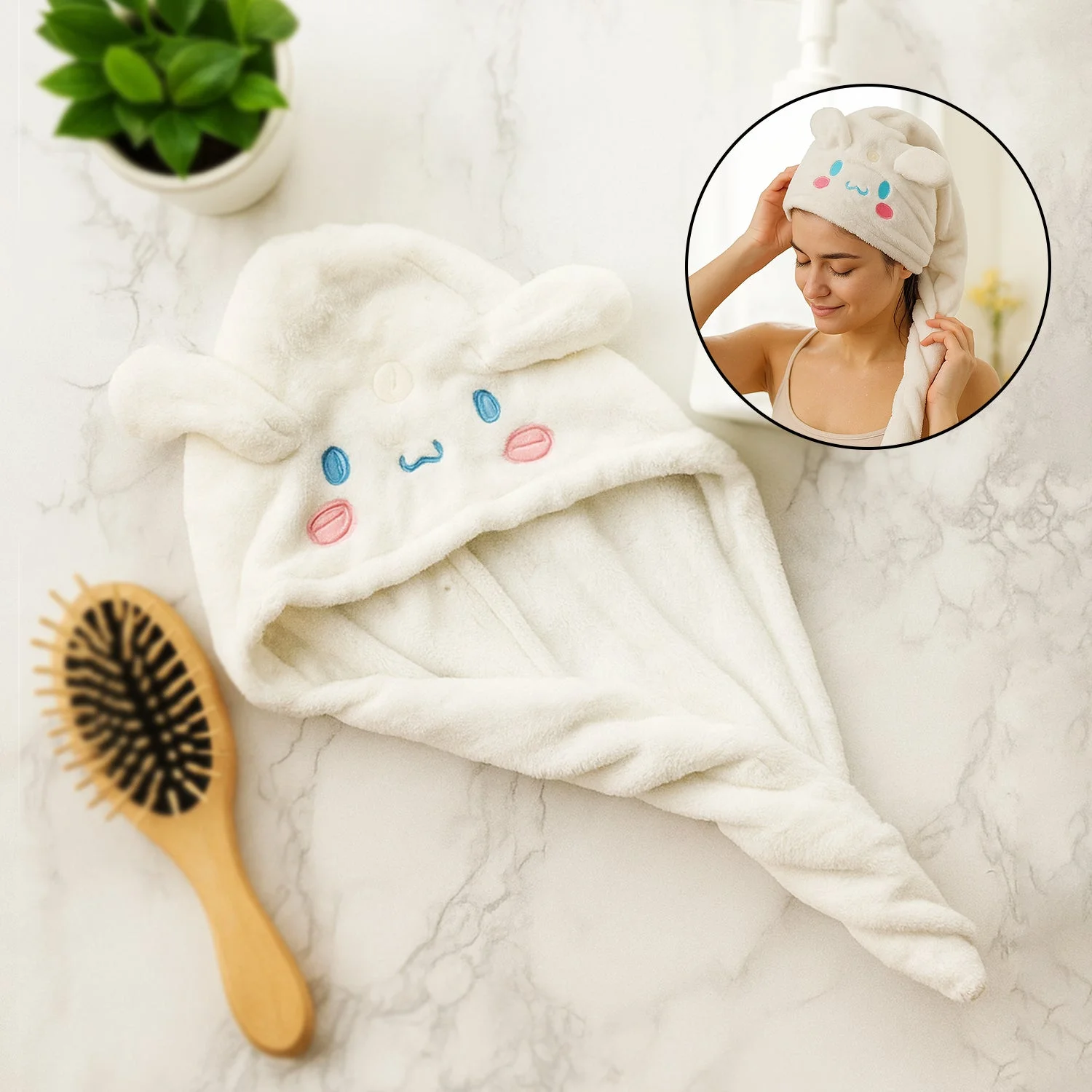 This cute and functional microfiber hair drying towel wrap is designed to make hair care both fun and effective. Crafted from ultra-soft, high-absorbency microfiber material, it quickly soaks up excess water without causing frizz or damage, reducing the need for heat styling. The towel features an adorable cartoon face design with plush 3D details, adding a playful touch to your post-shower routine. Its secure button-and-loop closure ensures a snug fit, keeping the towel in place while you move around. Lightweight and easy to use, it is perfect for daily use at home, gym, travel, or spa sessions.