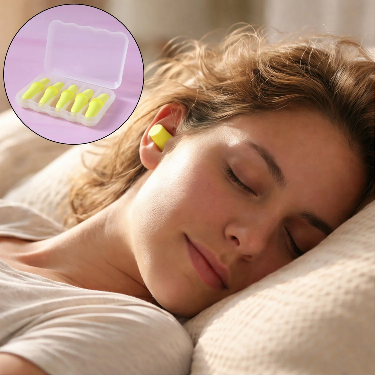 Enjoy peaceful sleep and uninterrupted focus with this 5 Pair set of soft reusable foam ear plugs designed for effective noise reduction and daily comfort. These lightweight ear plugs gently fit inside the ear canal to help block unwanted noise from traffic, snoring, machinery, and background disturbances. Made for extended wear, they provide a comfortable and secure fit without causing irritation. The included compact storage case keeps the ear plugs clean, organized, and easy to carry while traveling. Ideal for sleeping, studying, meditation, and work environments, these ear plugs are a practical solution for noise control anytime, anywhere.