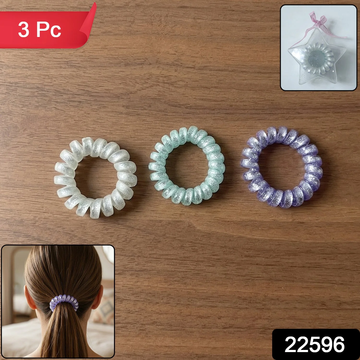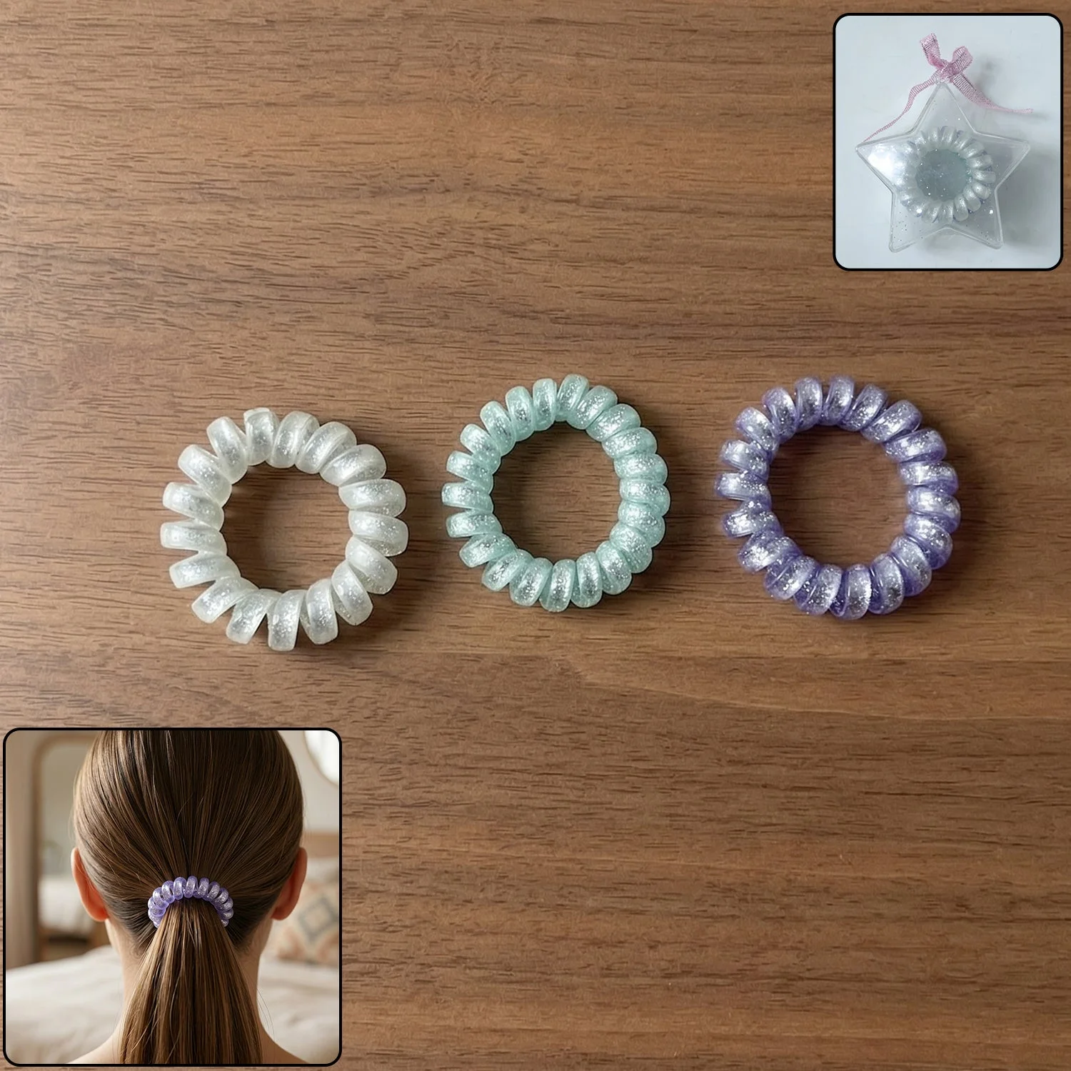 glitter spiral hair ties, coil hair bands, telephone wire hair ties, no crease hair ties, soft stretchable hair bands, strong hold hair ties, waterproof hair bands, ponytail holders for women, ponytail holders for girls, colorful hair ties set 3 pc, stylish hair accessories, tangle free hair ties, damage free hair bands, flexible spiral hair ties, everyday hair accessories, reusable hair ties, durable coil hair bands, casual hair bands for women, trendy hair bands, lightweight hair ties, multipurpose hair bands