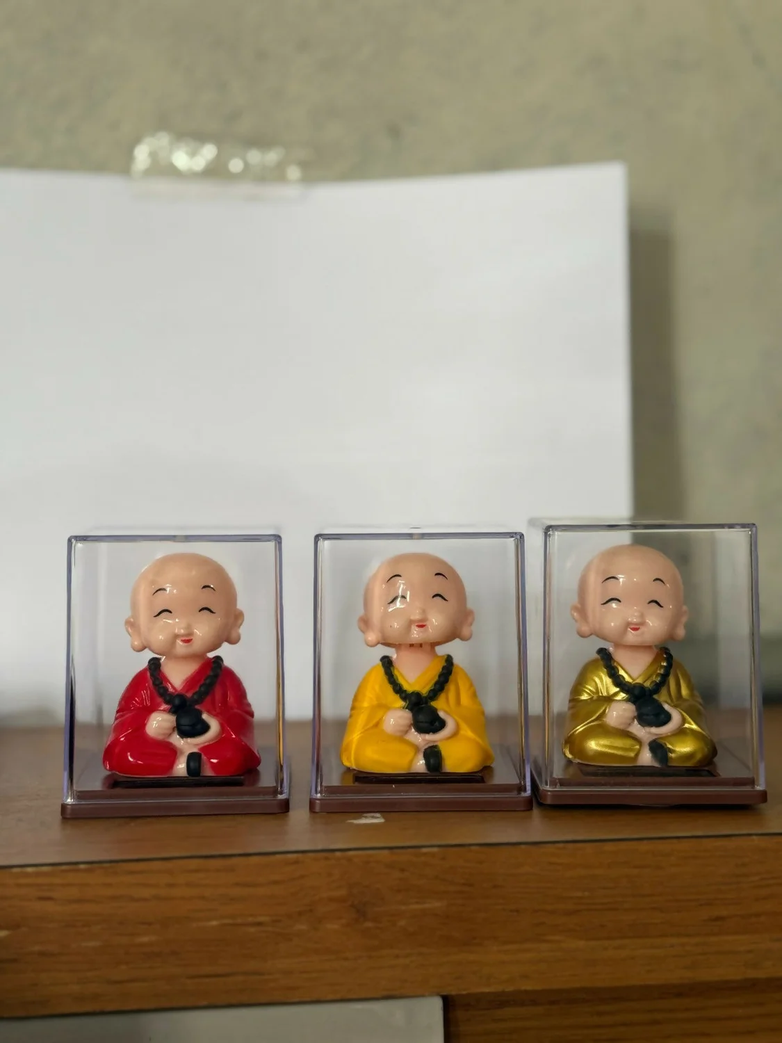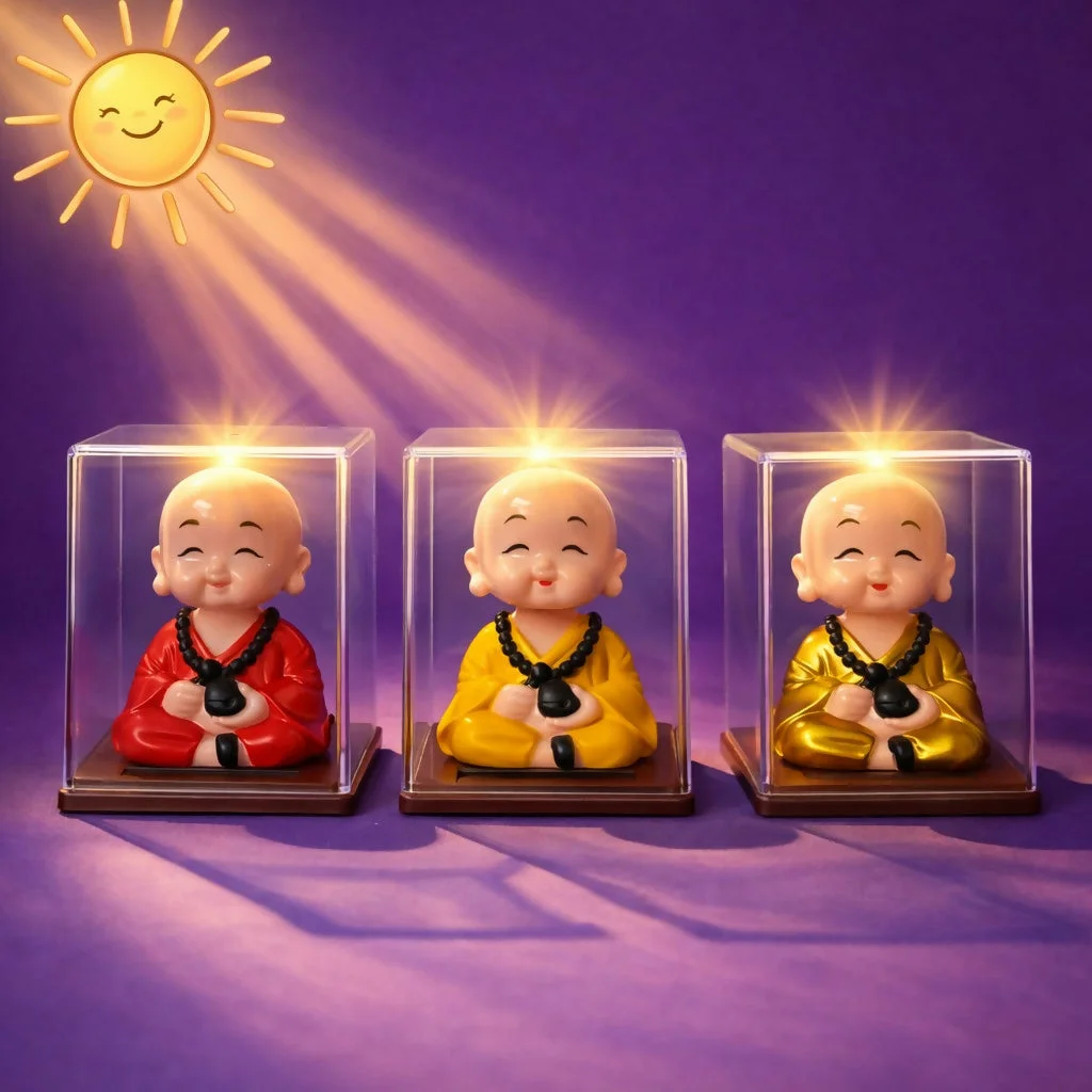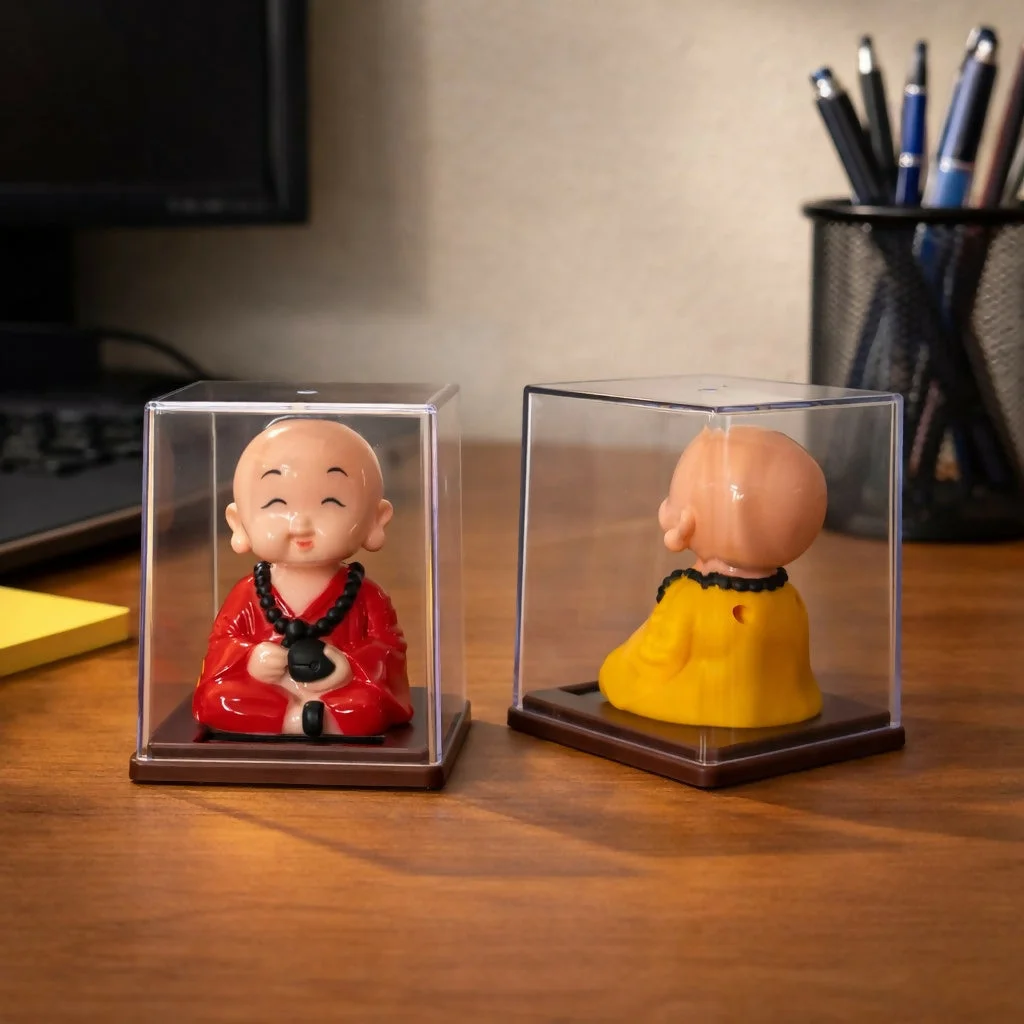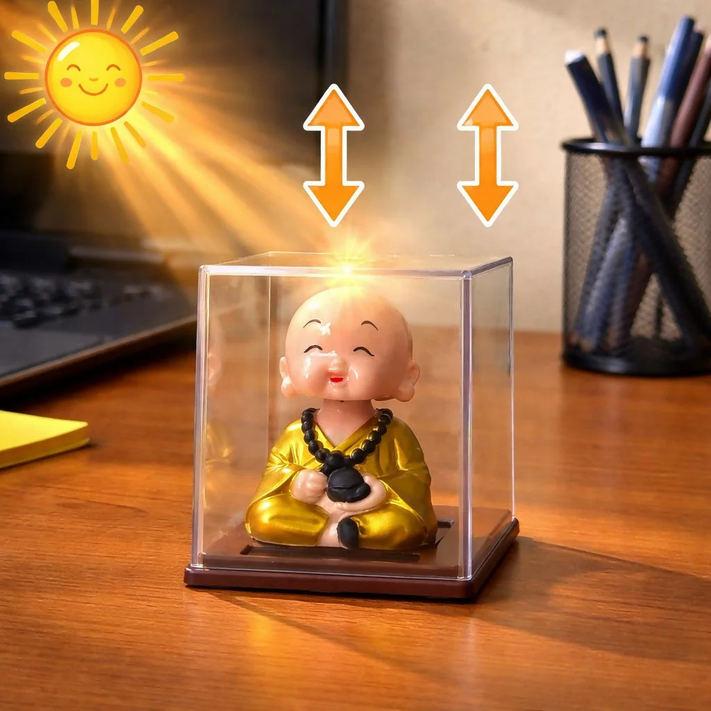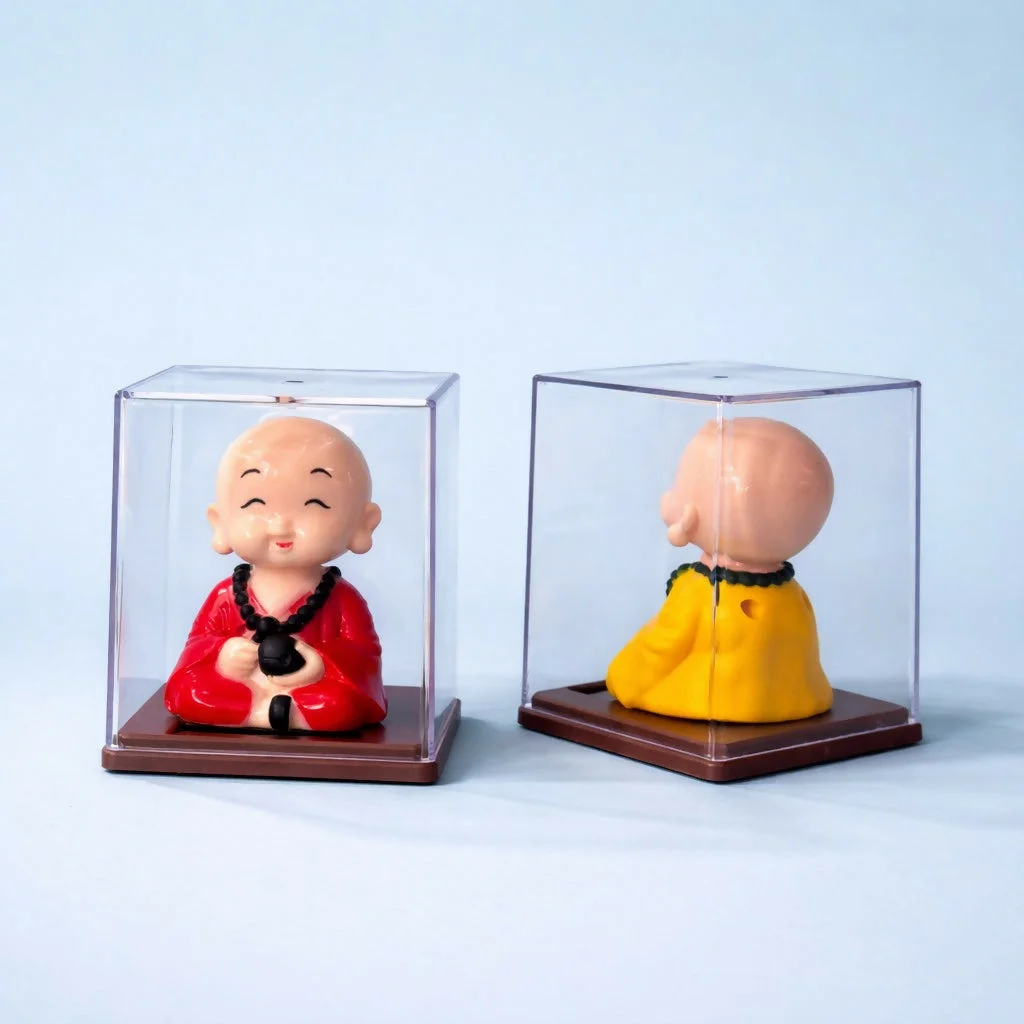 Bring positivity and charm to your space with this solar-powered monk bobble head. Designed with a cheerful expression, the figurine gently moves its head when exposed to light, creating a soothing and lively effect. Enclosed in a transparent display case, it stays protected while adding a decorative touch to your desk, office, or car dashboard. A perfect blend of spiritual calm and playful motion, making it a great choice for gifting or personal decor.