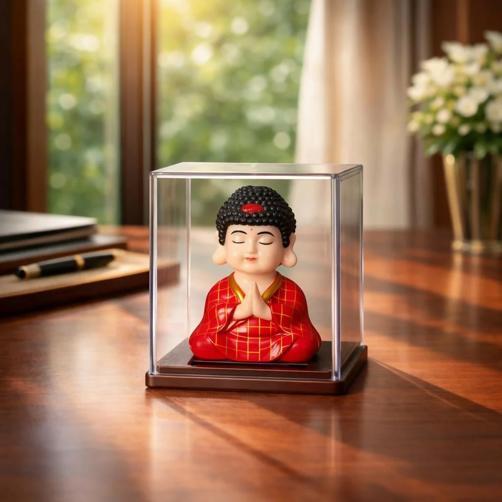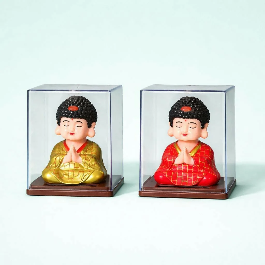 Add a touch of positivity and charm to your space with this solar-powered Buddha bobble head. Designed with a peaceful expression and gentle head movement, this figurine automatically bounces when exposed to light. Encased in a clear display box, it stays protected while enhancing your desk, car dashboard, or home decor setup. A perfect blend of spiritual vibe and playful motion, ideal for gifting or personal use.