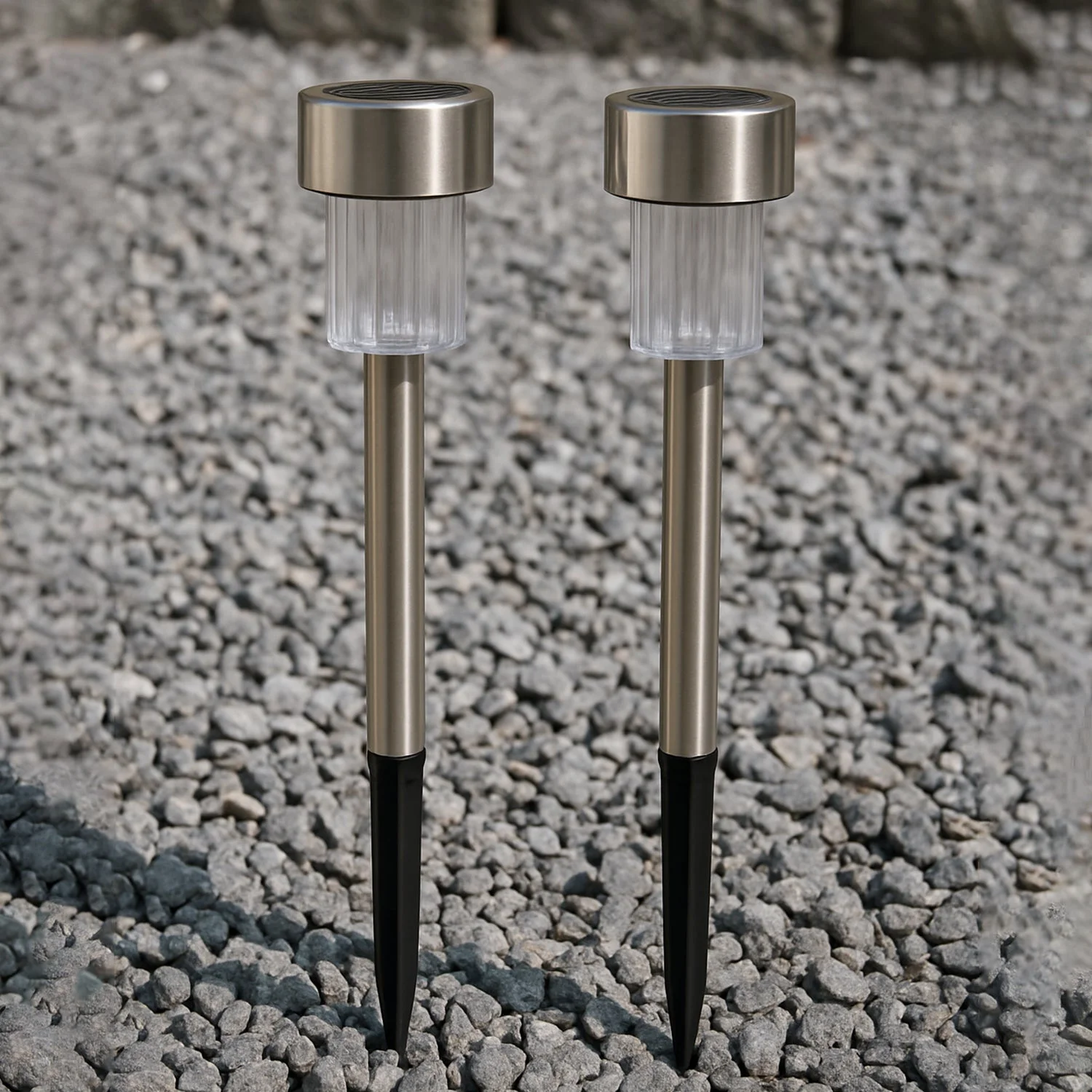 Enhance your outdoor space with this elegant pair of solar-powered garden lights. These stylish and energy-efficient LED stake lamps charge during the day via built-in solar panels and automatically illuminate at night, providing warm ambient lighting to your garden, pathways, or yard. Constructed from durable stainless steel with a transparent lamp shade, these waterproof outdoor lights are easy to install and require no wiring. Simply push them into the ground for an instant upgrade to your landscape aesthetics and safety. Ideal for creating a cozy nighttime atmosphere while also ensuring visibility and security outdoors.