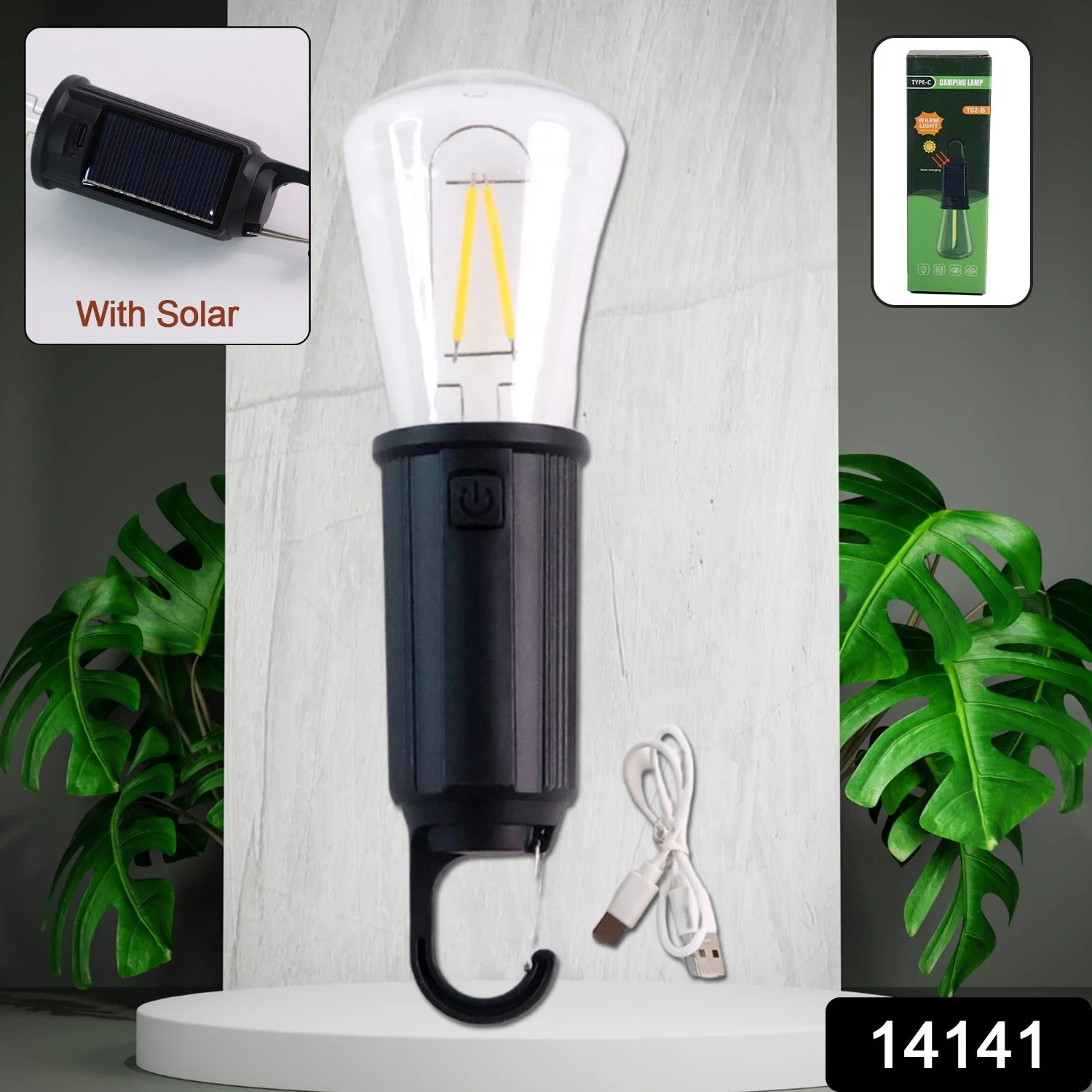 Solar & USB Rechargeable LED Hanging Camping Bulb Lantern Light – Portable Emergency Lamp with Hook – Vintage Filament Look, Dual Charging via USB & Solar Panel – Ideal for Outdoor/Indoor Use – 1 Pc