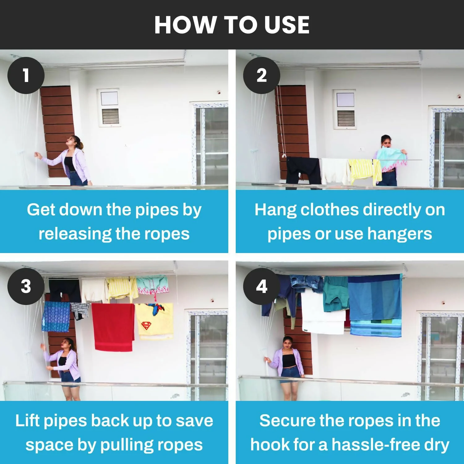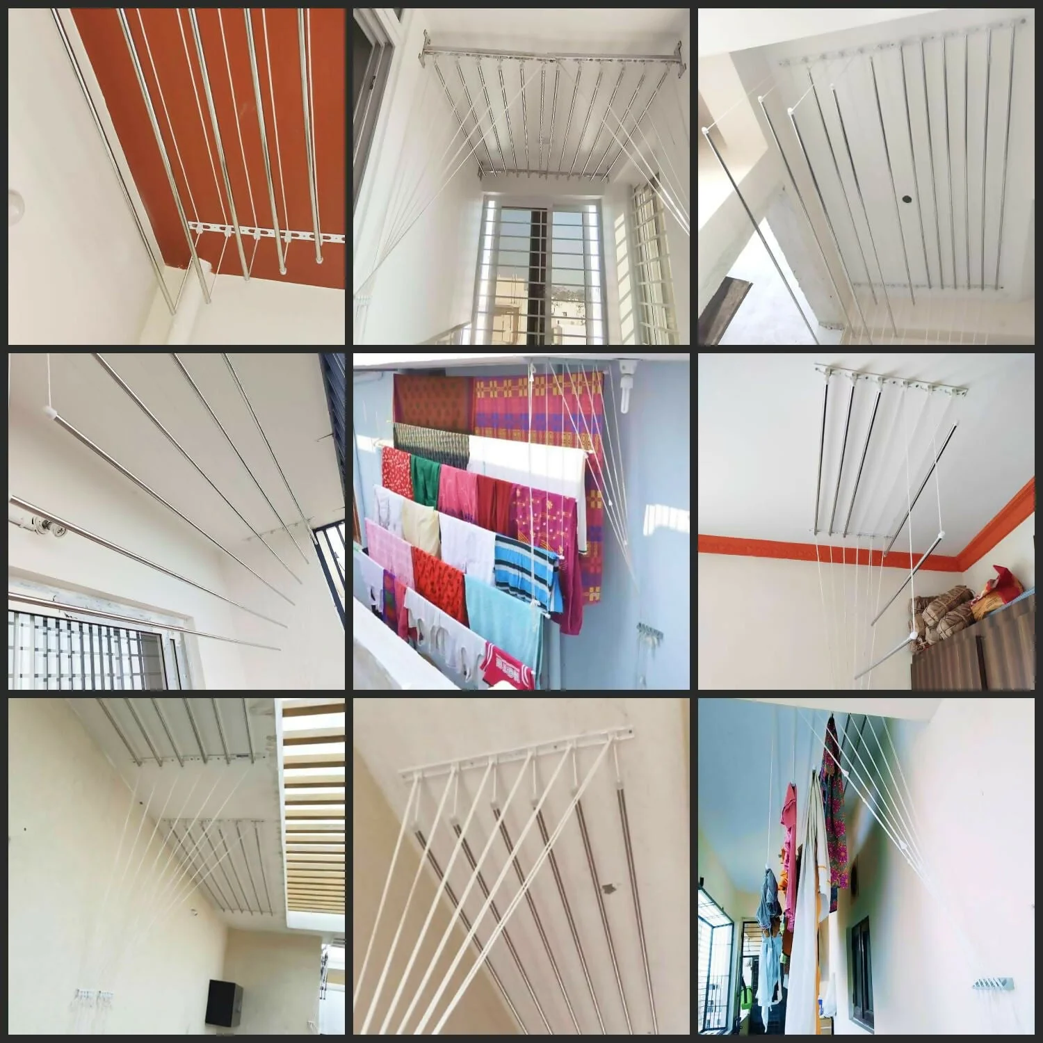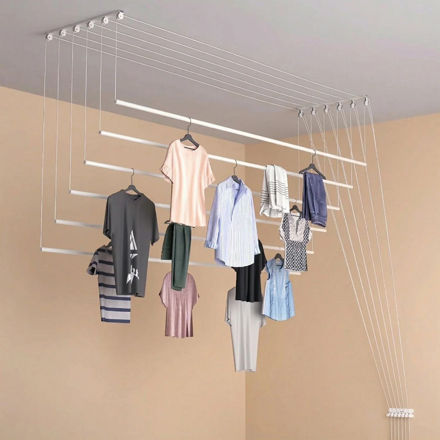 Upgrade your laundry experience with this space-saving ceiling mounted cloth drying hanger designed for modern homes. This innovative pull-down drying system allows you to easily lower the rods for hanging clothes and lift them back up to save space. Perfect for balconies, utility areas, and indoor drying, it keeps your clothes organized while maximizing vertical space. The strong pipe structure ensures durability and supports multiple garments at once, making it ideal for daily household use.