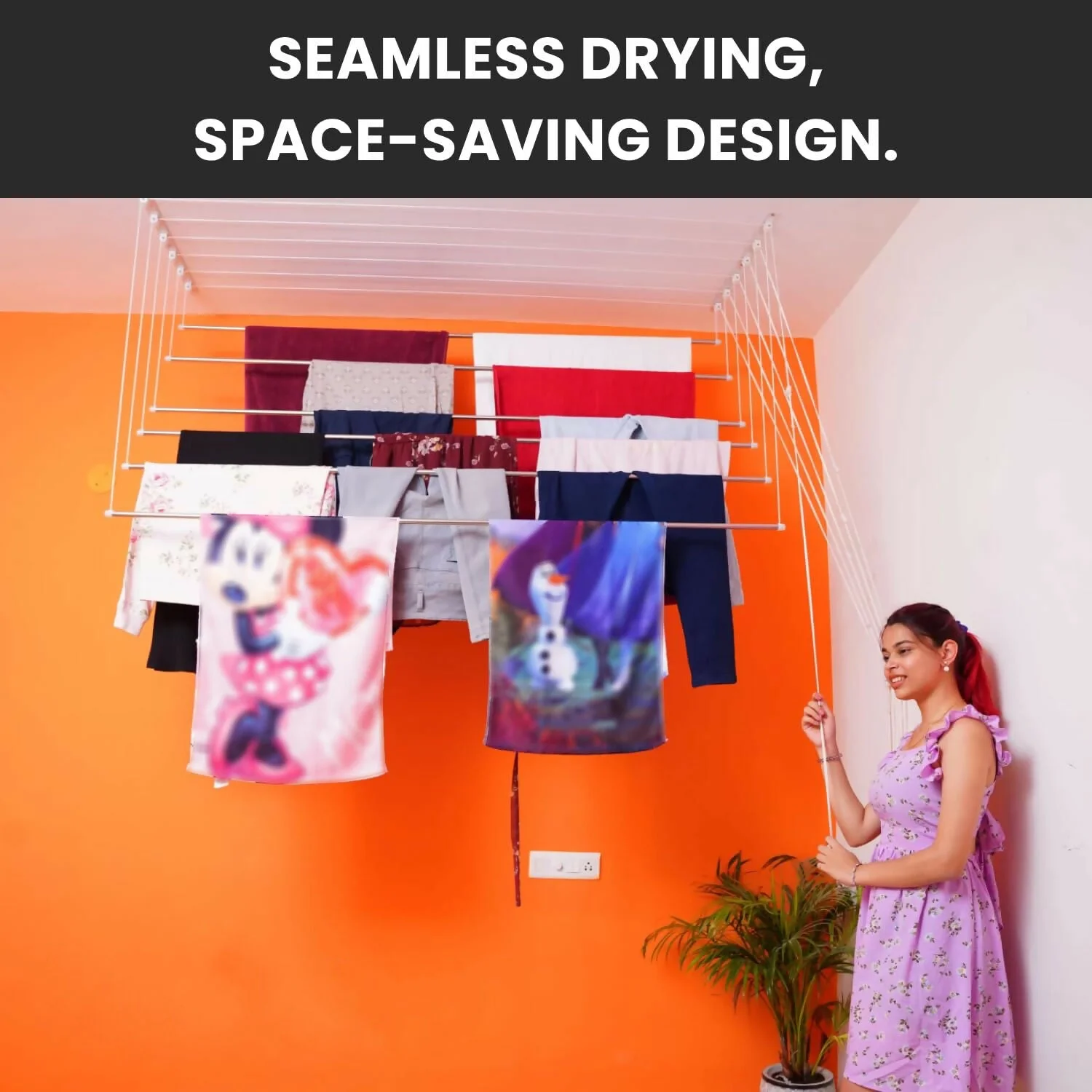 This drop-down ceiling cloth dryer is available in multiple size options including 6 ft, 7 ft, and 8 ft, along with 3, 4, 5, and 6 pipe configurations, allowing you to choose the perfect setup based on your space and drying needs. Its easy-to-use rope mechanism ensures smooth operation and hassle-free drying every time.