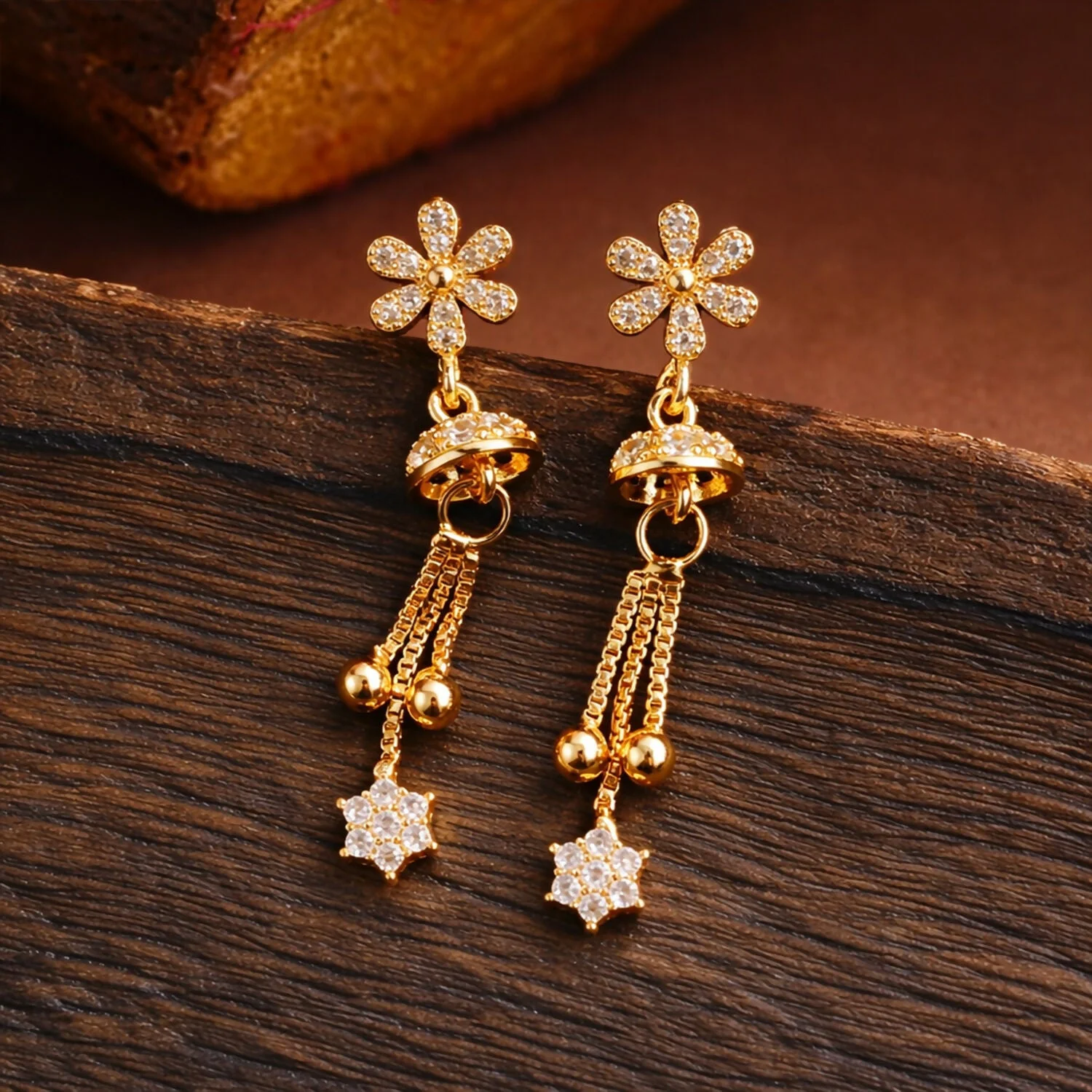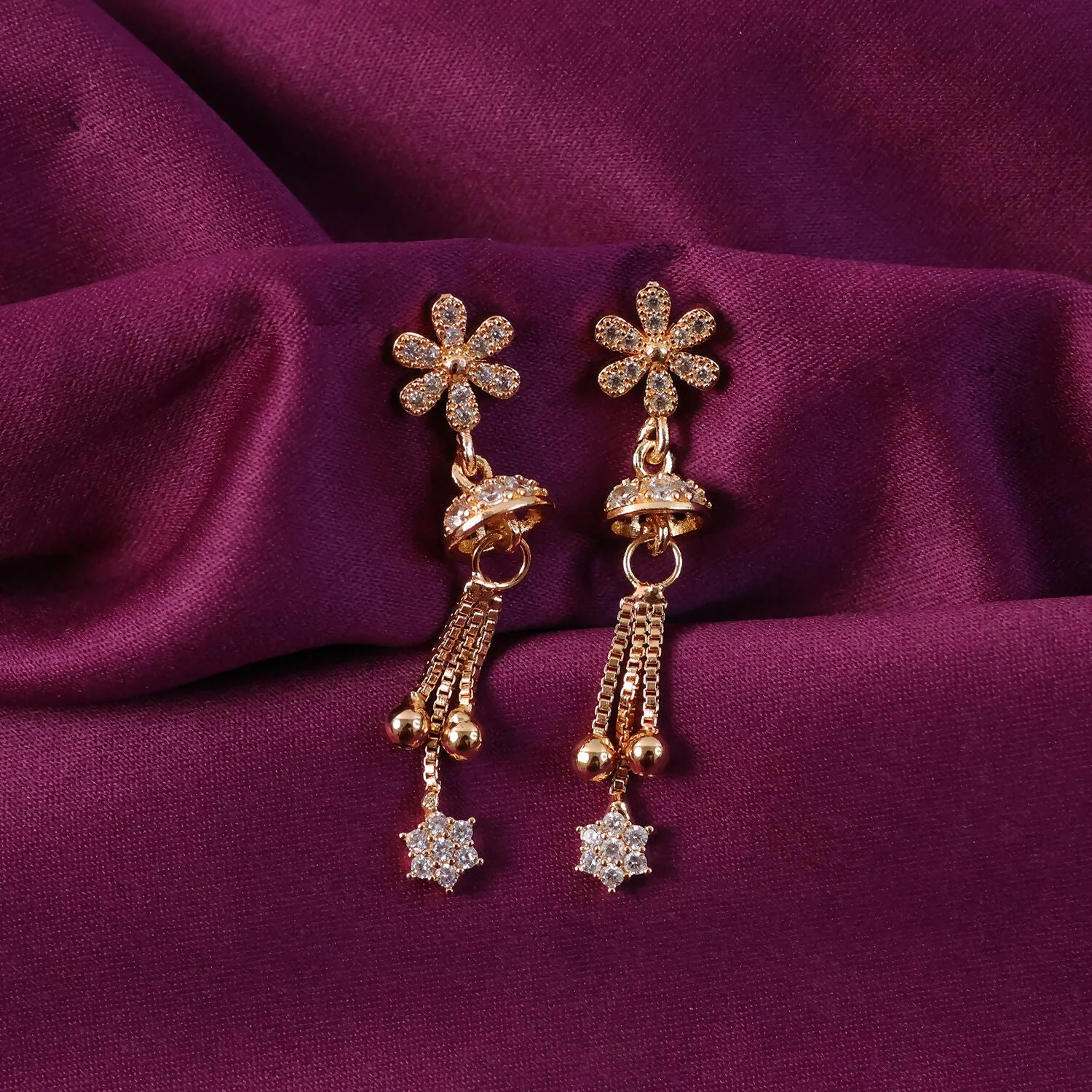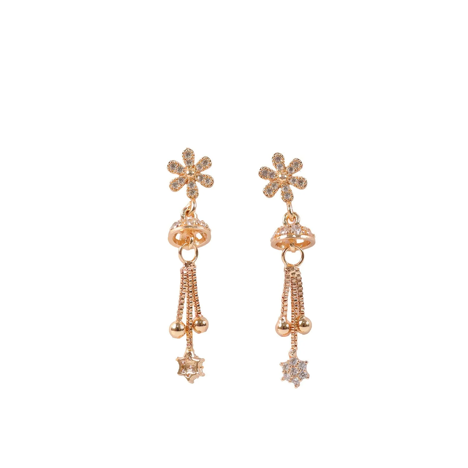 Graceful Shine with a Modern Edge Illuminate your look with these charming rose-gold-toned drop earrings. The design features a unique, sharp geometric stud that transitions into a delicate, dangling floral star, creating a beautiful balance of strength and softness.