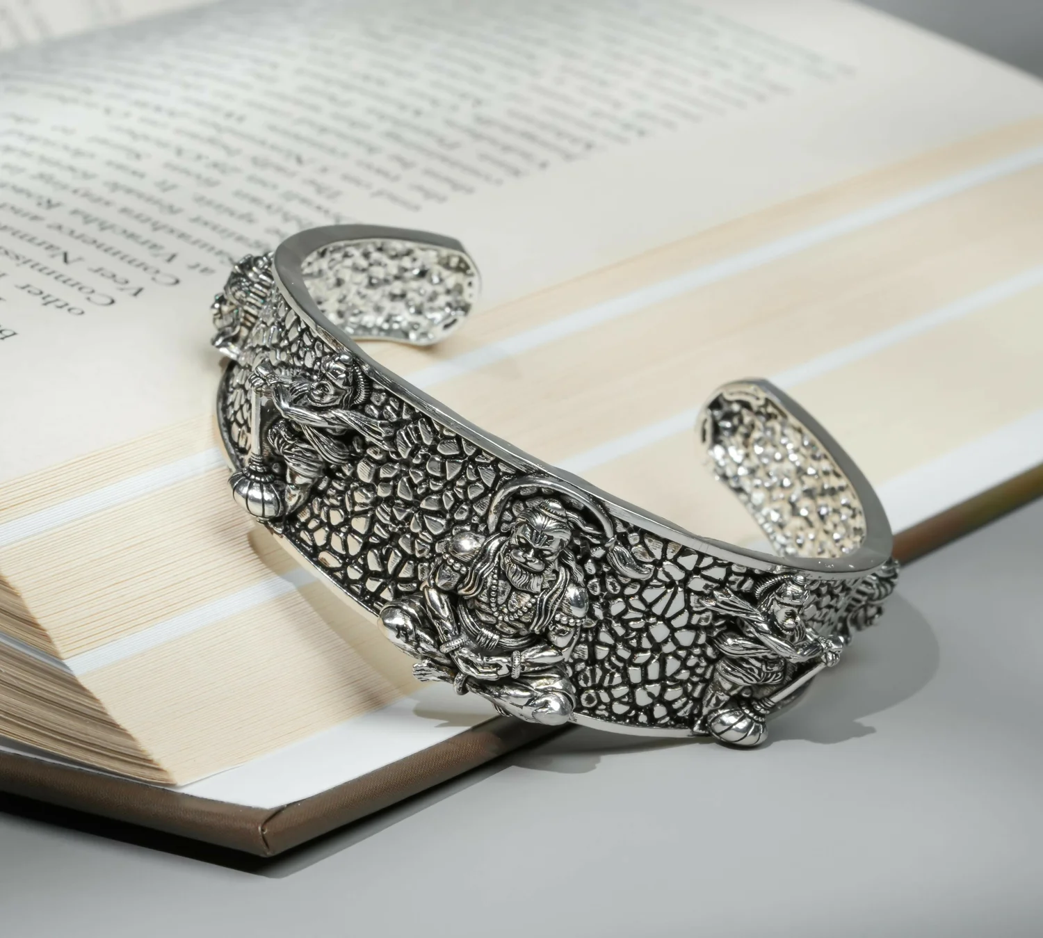 A beautifully crafted Hanumanji kada featuring intricate carvings of Lord Hanuman in a meditative pose with devotional detailing. This antique finish bracelet combines spiritual significance with a bold traditional look, making it perfect for daily wear, religious occasions, or gifting. The adjustable open design ensures a comfortable fit for any wrist.