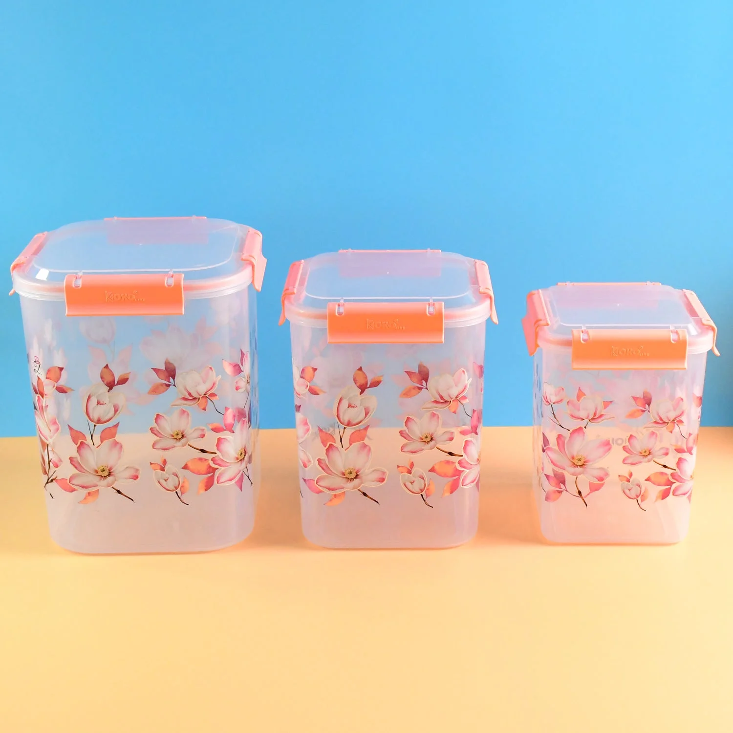 This 3-piece storage container set is perfect for elevating your kitchen organization while adding aesthetic charm. Made from premium quality BPA-free plastic, each container features a vibrant floral print and is equipped with sturdy orange clip-lock lids to ensure airtight storage. The transparent body allows easy visibility of contents, while the secure seal preserves freshness. These containers are ideal for storing dry food, pulses, snacks, rice, flour, and more.