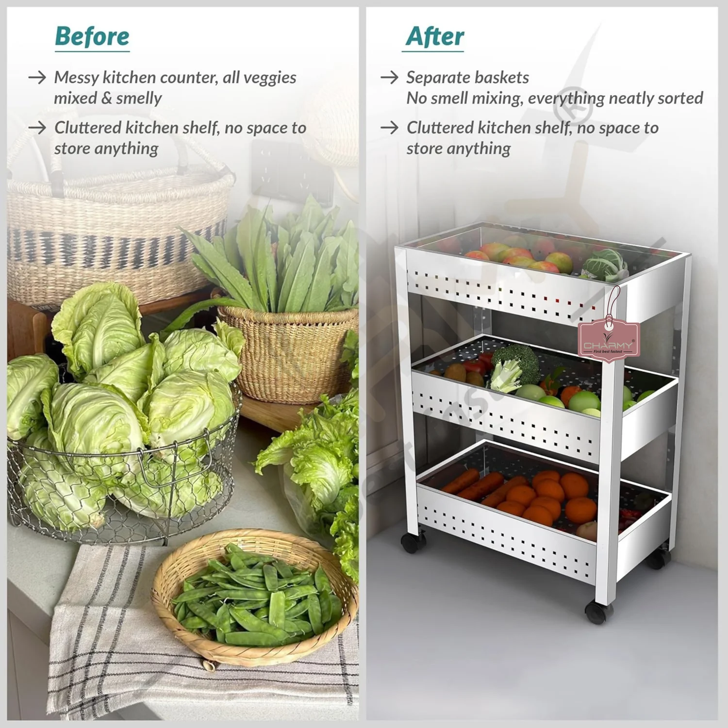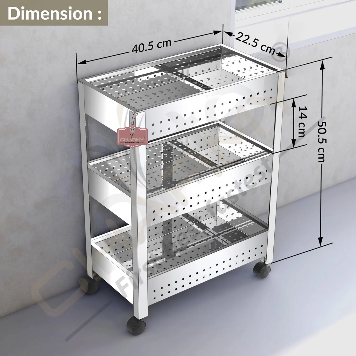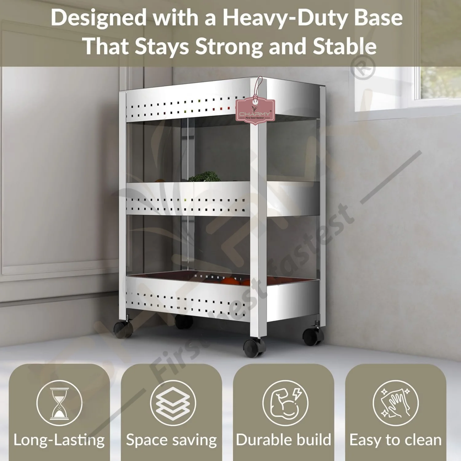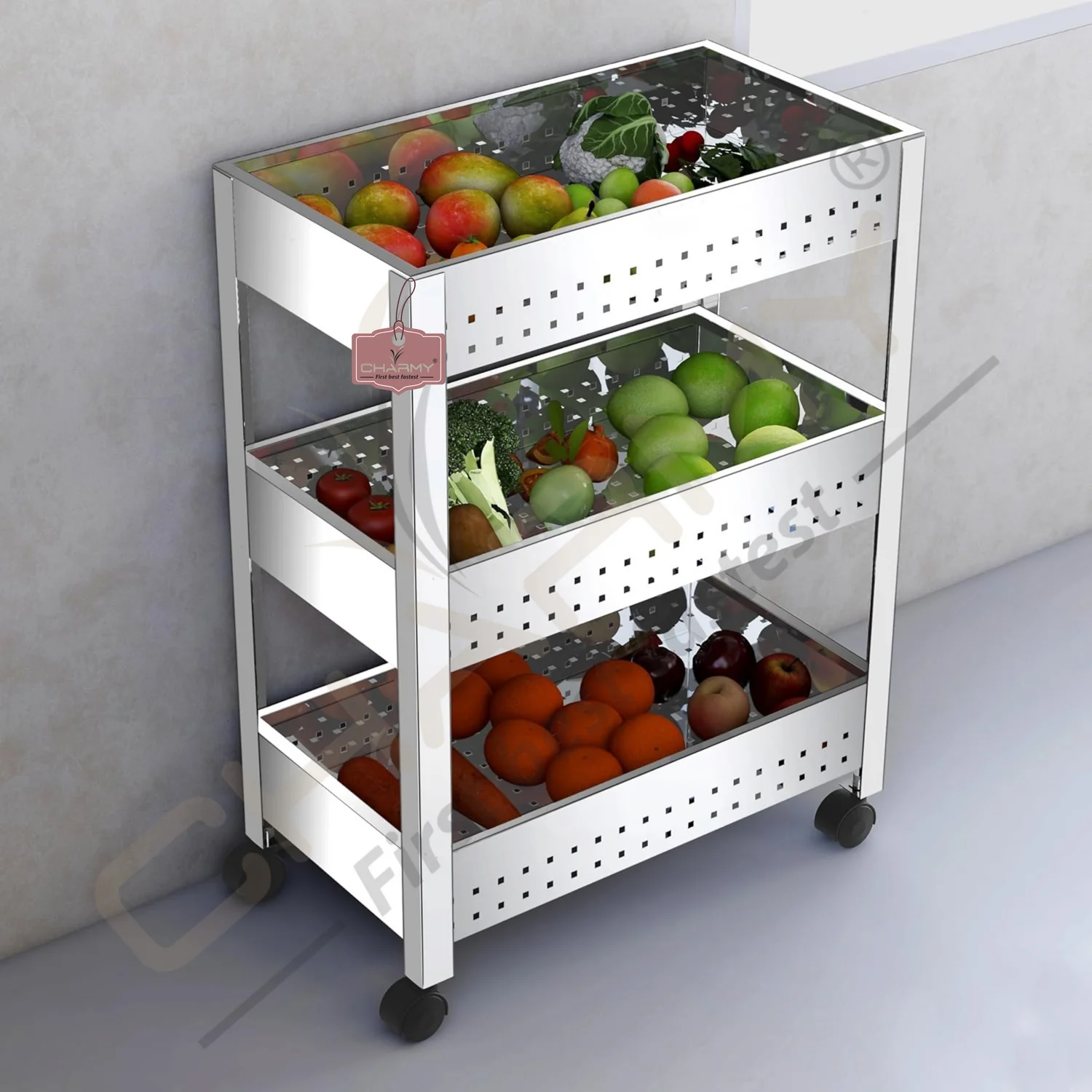 Upgrade your kitchen storage with the Charmy Stainless Steel 3-Tier Vegetable Storage Trolley — a premium-quality kitchen organizer that blends durability with functionality. This multipurpose stand is perfect for storing onions, garlic, potatoes, and fruits, or even non-kitchen items like toiletries and stationery.