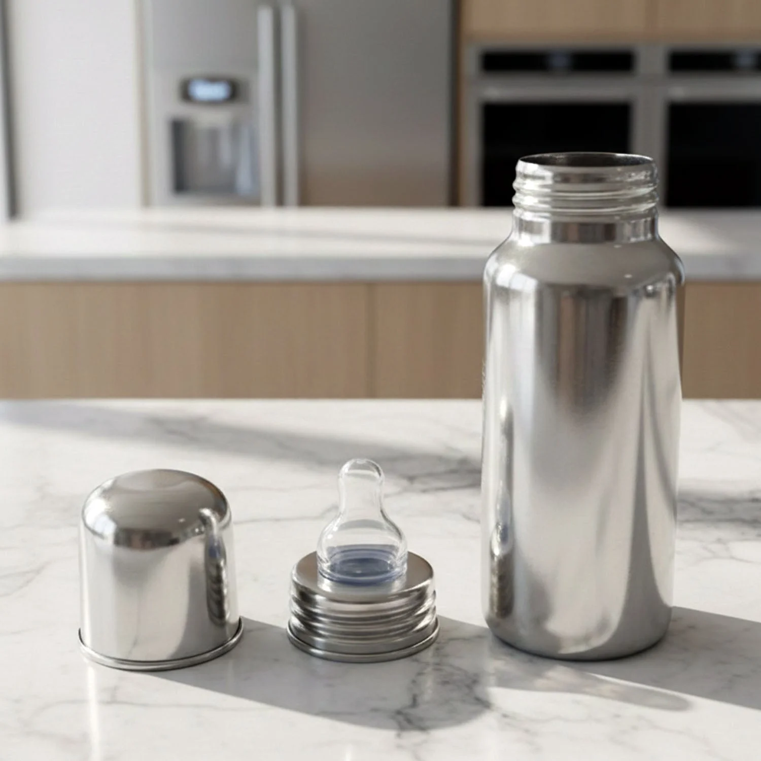 Make baby feeding safer and more convenient with this Stainless Steel Baby Feeding Bottle designed for daily use. This feeding bottle comes with a soft silicone nipple that provides a comfortable feeding experience for infants. The stainless steel body offers better durability and hygiene, making it a reliable alternative to regular bottles. The secure screw neck helps prevent leakage while feeding or carrying in a diaper bag. Its compact size makes it ideal for home use, travel, and night feeding. The smooth body is easy to hold and easy to clean, helping parents maintain better feeding hygiene. Perfect for milk, formula, and other baby feeding needs, this bottle is a must-have for every newborn care kit.