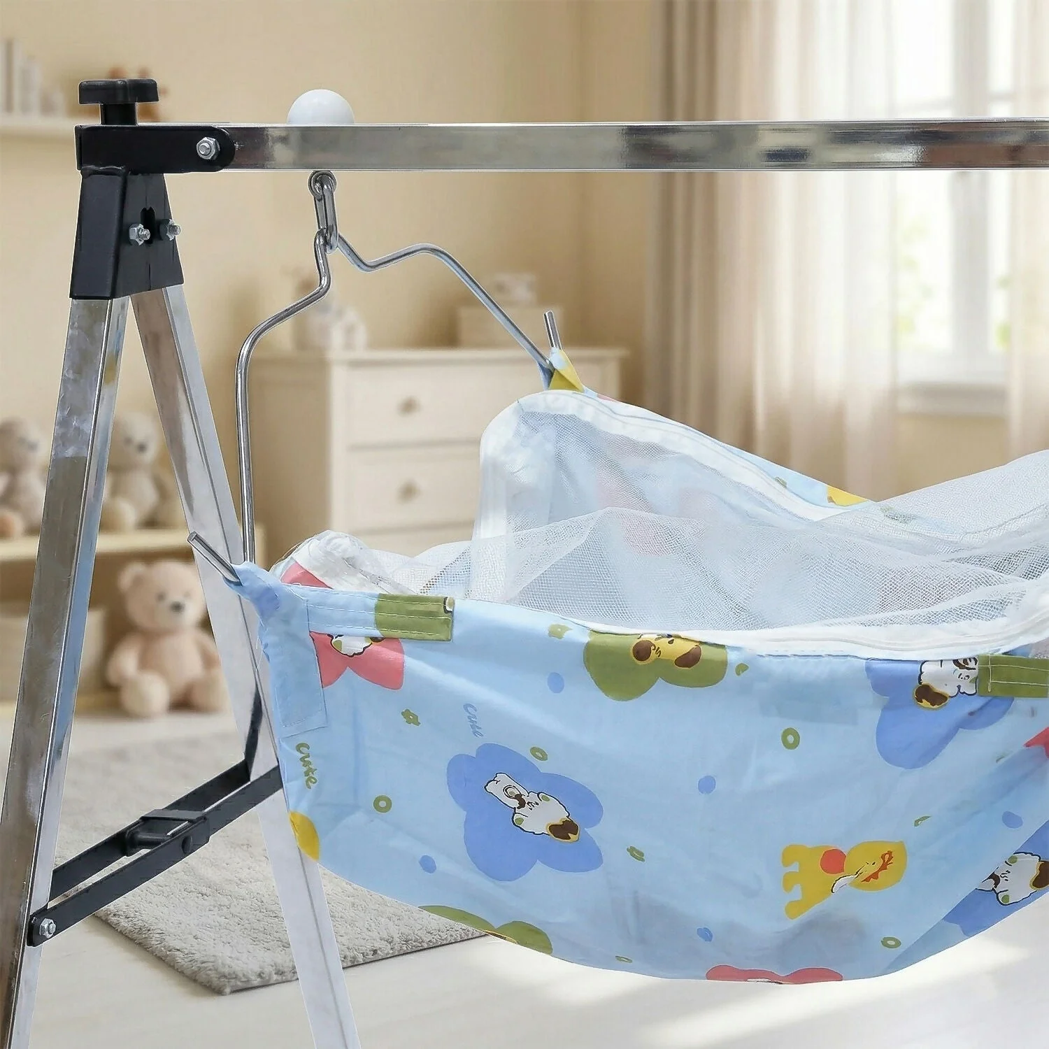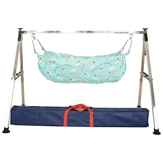 The sturdy, foldable metal stand ensures safety and stability, while the breathable, colorful hammock provides maximum comfort. Perfect for indoor use, it blends beautifully into any nursery or bedroom setting.