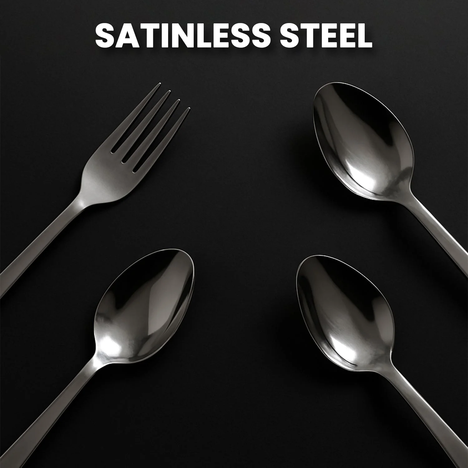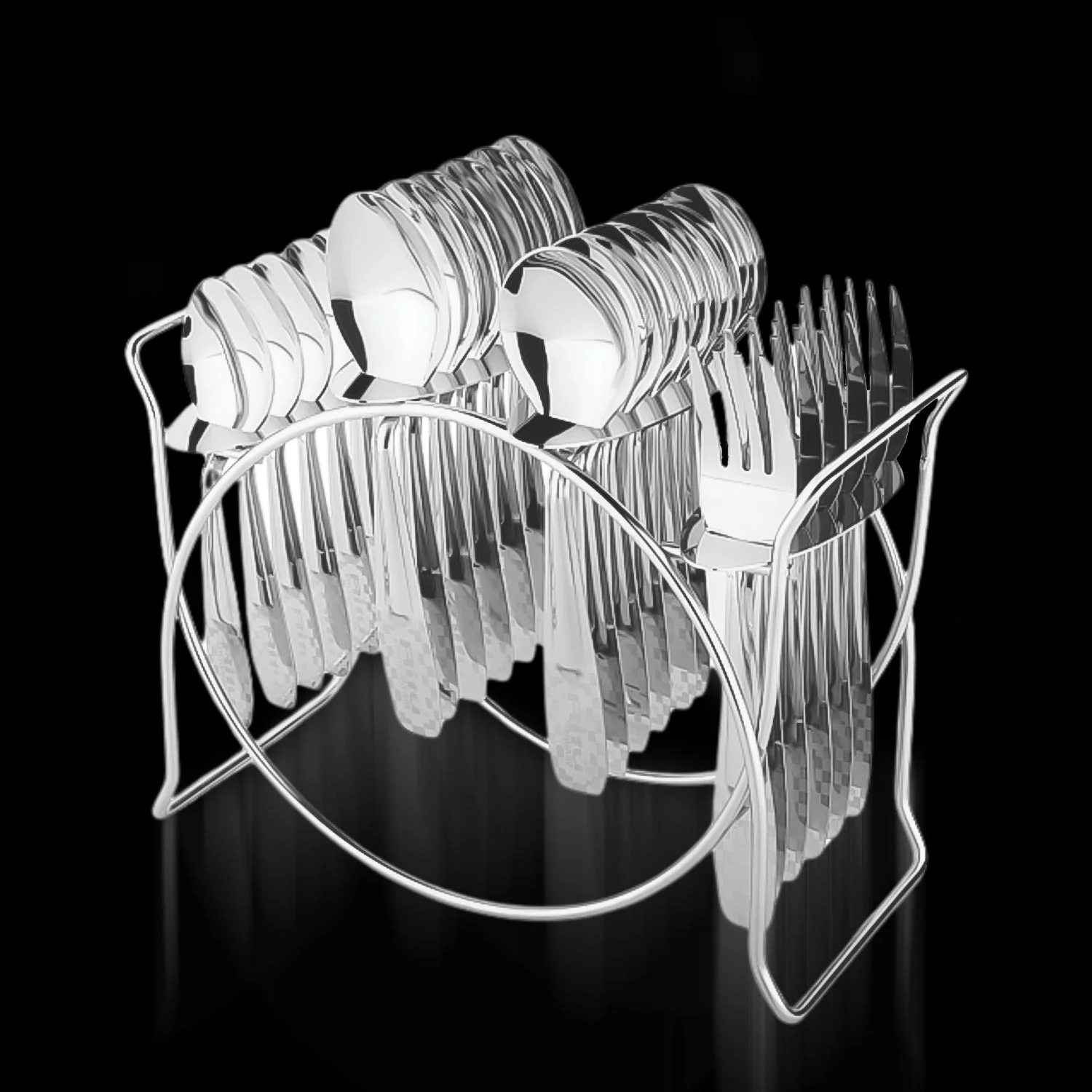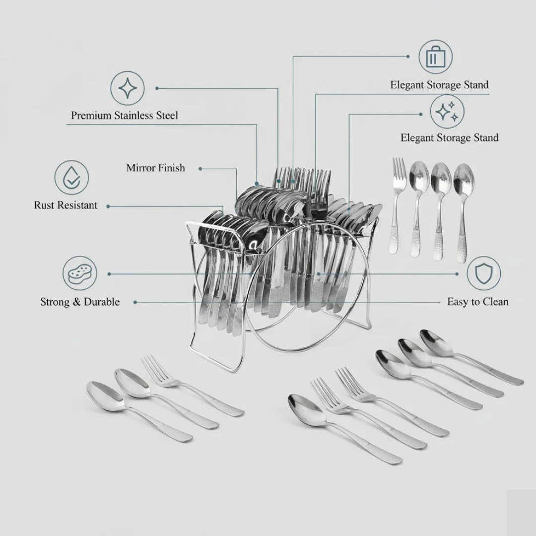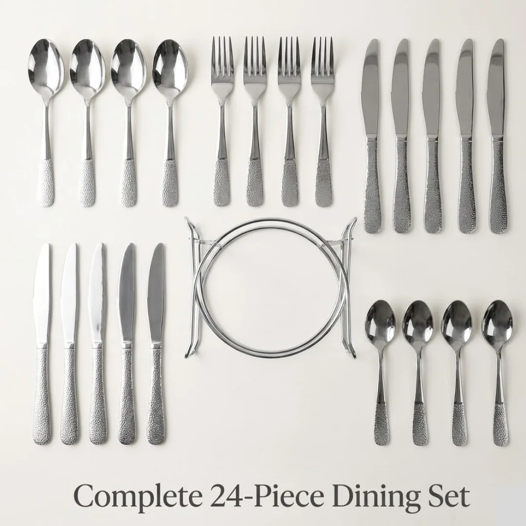 Upgrade your dining table with this elegant 24-piece stainless steel cutlery set. Featuring a sleek mirror-polished finish, this premium set includes spoons, forks, and knives, designed to provide a comfortable grip and exceptional durability. Crafted from high-quality stainless steel, the cutlery is resistant to rust and easy to clean, ensuring long-lasting shine and reliability. The set comes complete with an attractive and functional stainless steel storage stand, keeping your cutlery neatly organized and accessible. Perfect for daily meals, festive gatherings, special occasions, or as a thoughtful gift, this sophisticated set effortlessly blends style, convenience, and quality.