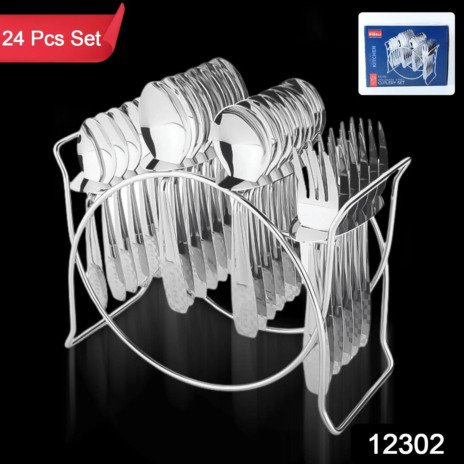 24 Pc Stainless Steel Cutlery Set with Elegant Storage Stand – Mirror Finish Spoons, Forks, and Knives for Home Dining, Events, and Gifts (Silver)
