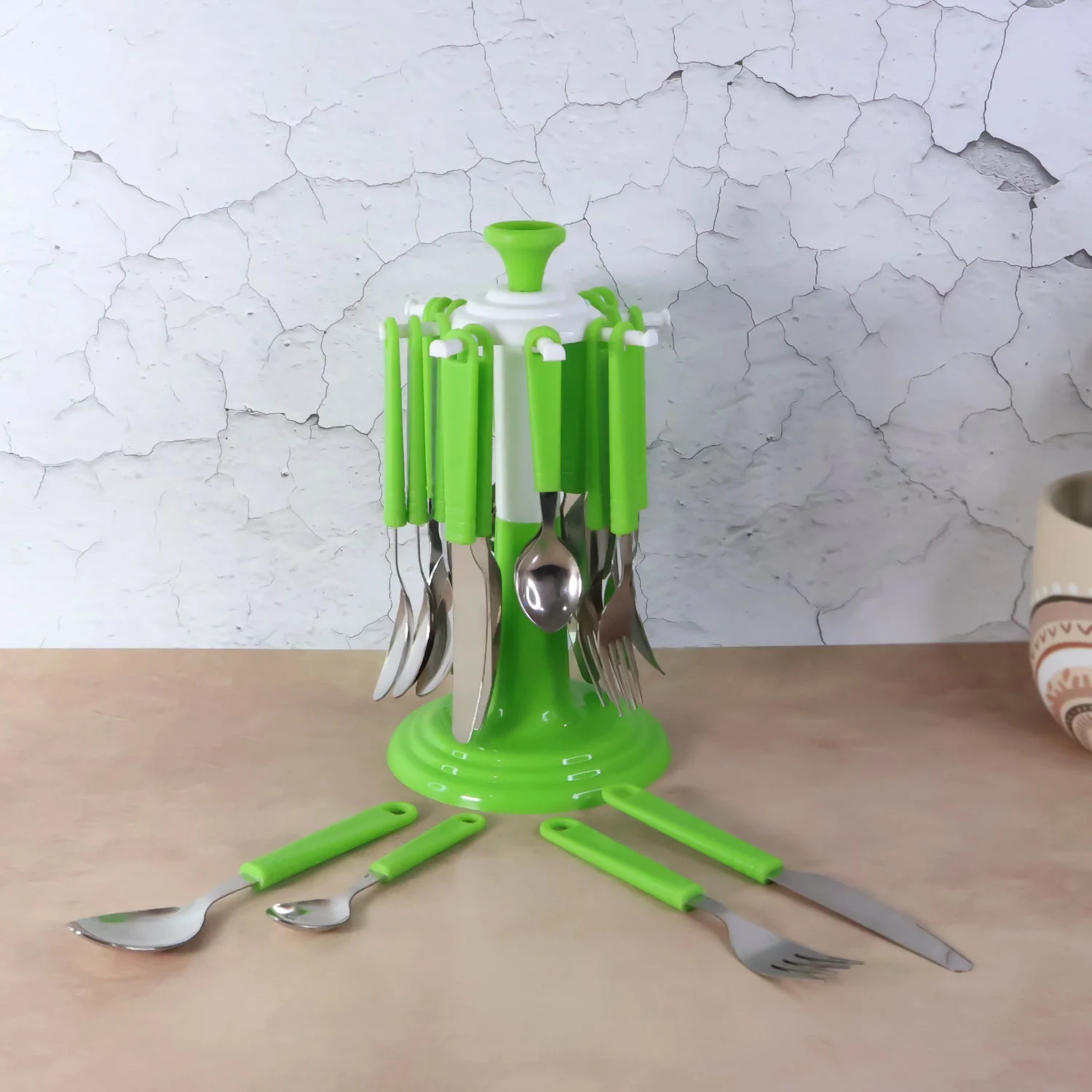 This stainless steel cutlery set with stand is designed to bring elegance and convenience to your dining table. Crafted from high-quality stainless steel, it includes a complete assortment of dining spoons, forks, and knives, perfect for everyday meals as well as special occasions. The sturdy rotating stand keeps the cutlery organized, hygienic, and easy to access, while the sleek handles offer a comfortable grip. Rust-resistant and durable, this set combines functionality with a stylish look, making it ideal for both home and office use.