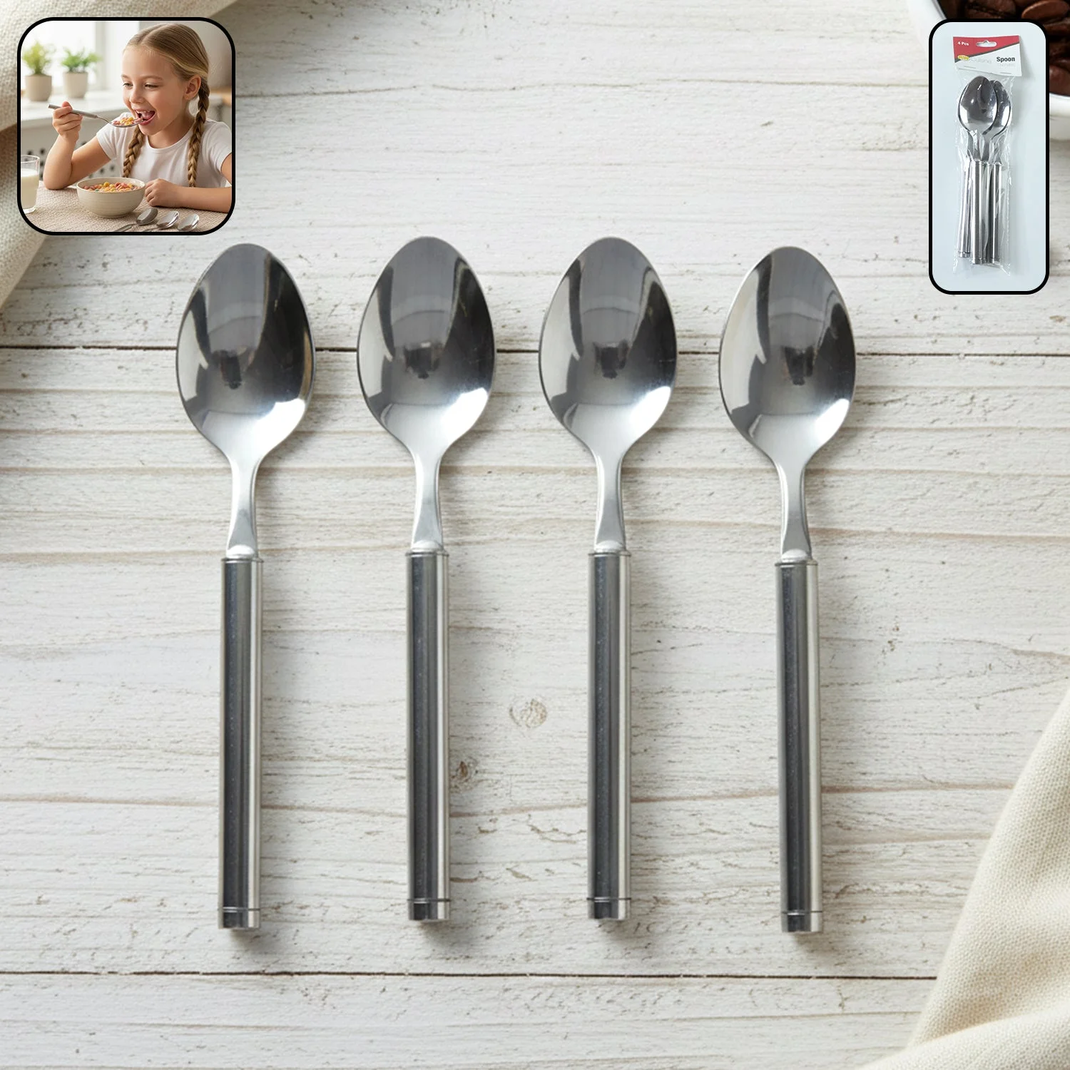 Upgrade your everyday dining essentials with this 4 pieces stainless steel dinner spoon set designed for durability and comfort. Crafted from high quality stainless steel, these table spoons feature a sleek silver finish that complements any dining setup. The sturdy handle design ensures a comfortable grip while eating meals, desserts or snacks. Ideal for regular home use as well as serving guests, these spoons are strong, reusable and easy to maintain. Their simple and modern design makes them suitable for both casual and formal table settings.