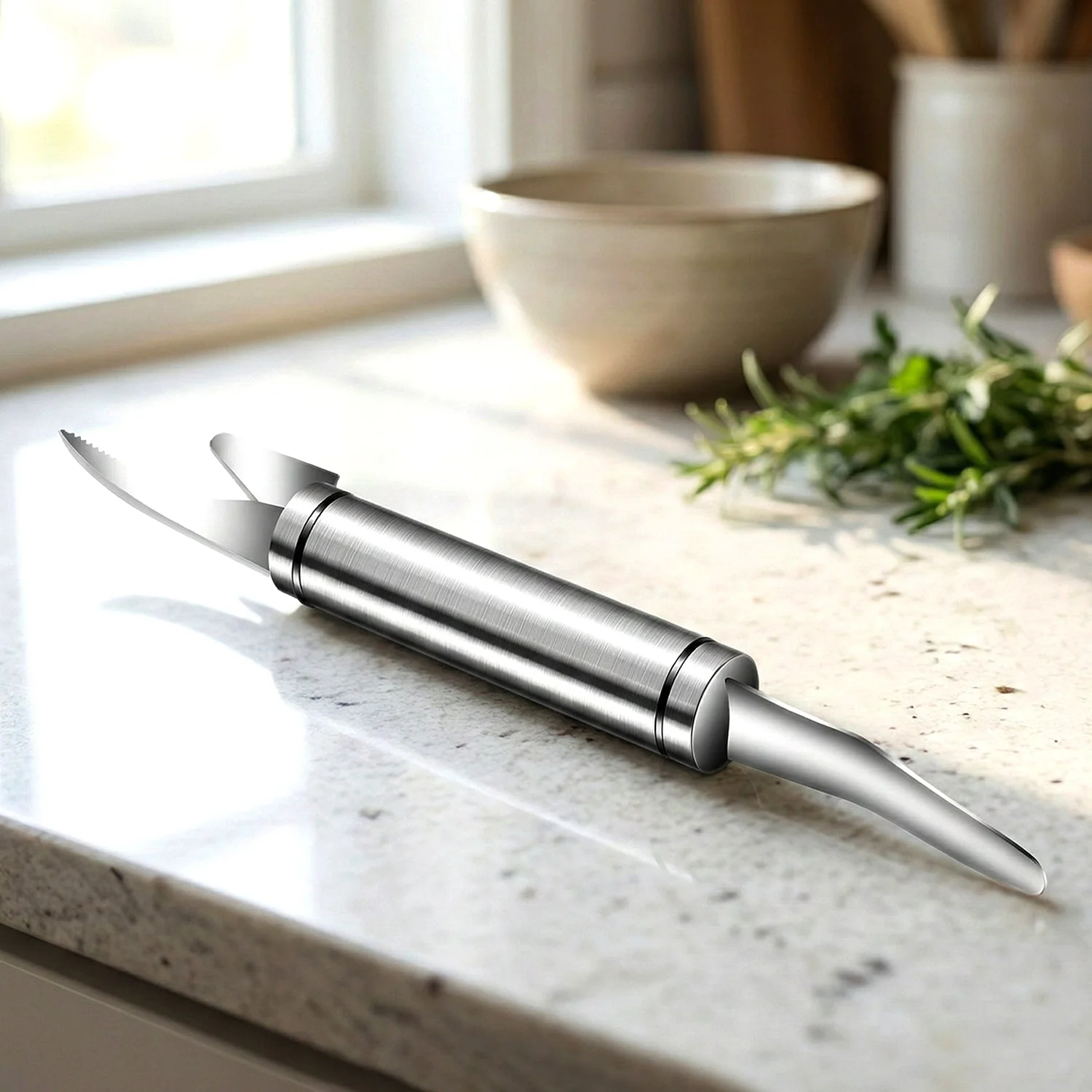 The Stainless Steel Fruit & Vegetable Corer and Slicer is a versatile kitchen utility designed to simplify delicate food preparation tasks with precision and control. Its slim, dual-ended design allows easy handling for cleaning, coring, slicing, and fine trimming of fruits, vegetables, and seafood. The sharp, well-shaped edges help remove unwanted parts efficiently while maintaining the natural texture of ingredients. Ideal for everyday cooking as well as detailed prep work, this tool enhances speed, hygiene, and accuracy in the kitchen.