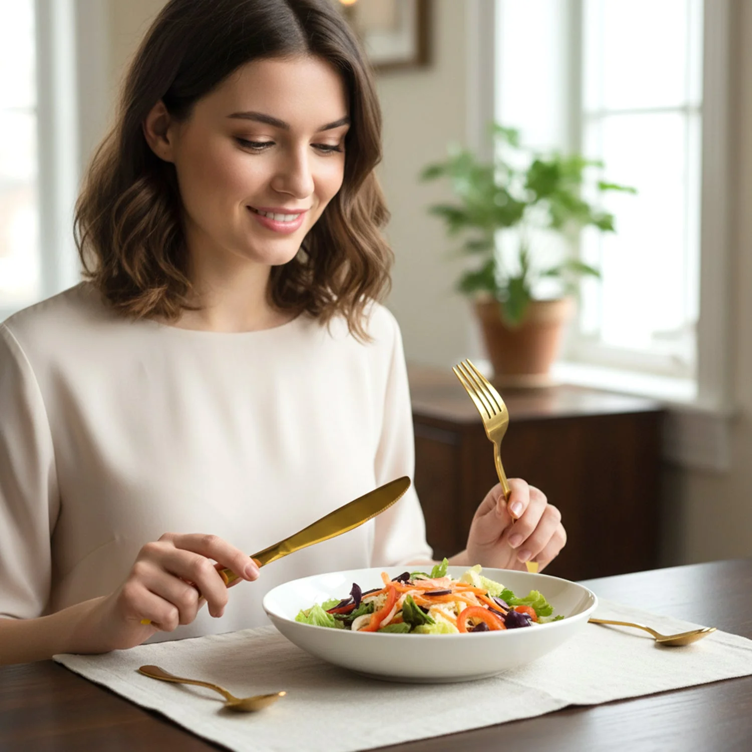 Add a royal touch to your dining space with this luxury 24 piece stainless steel gold finish cutlery set presented in a stylish pineapple themed storage stand. Designed to combine elegance and functionality, this set includes 6 spoons, 6 forks, 6 knives and 6 tea spoons neatly arranged in a decorative holder. The mirror gold finish enhances your table setting, making it perfect for special occasions and festive gatherings. Crafted from durable stainless steel, each piece offers strength, shine and long lasting performance. Ideal for modern homes, this designer cutlery set also makes an impressive gift choice.