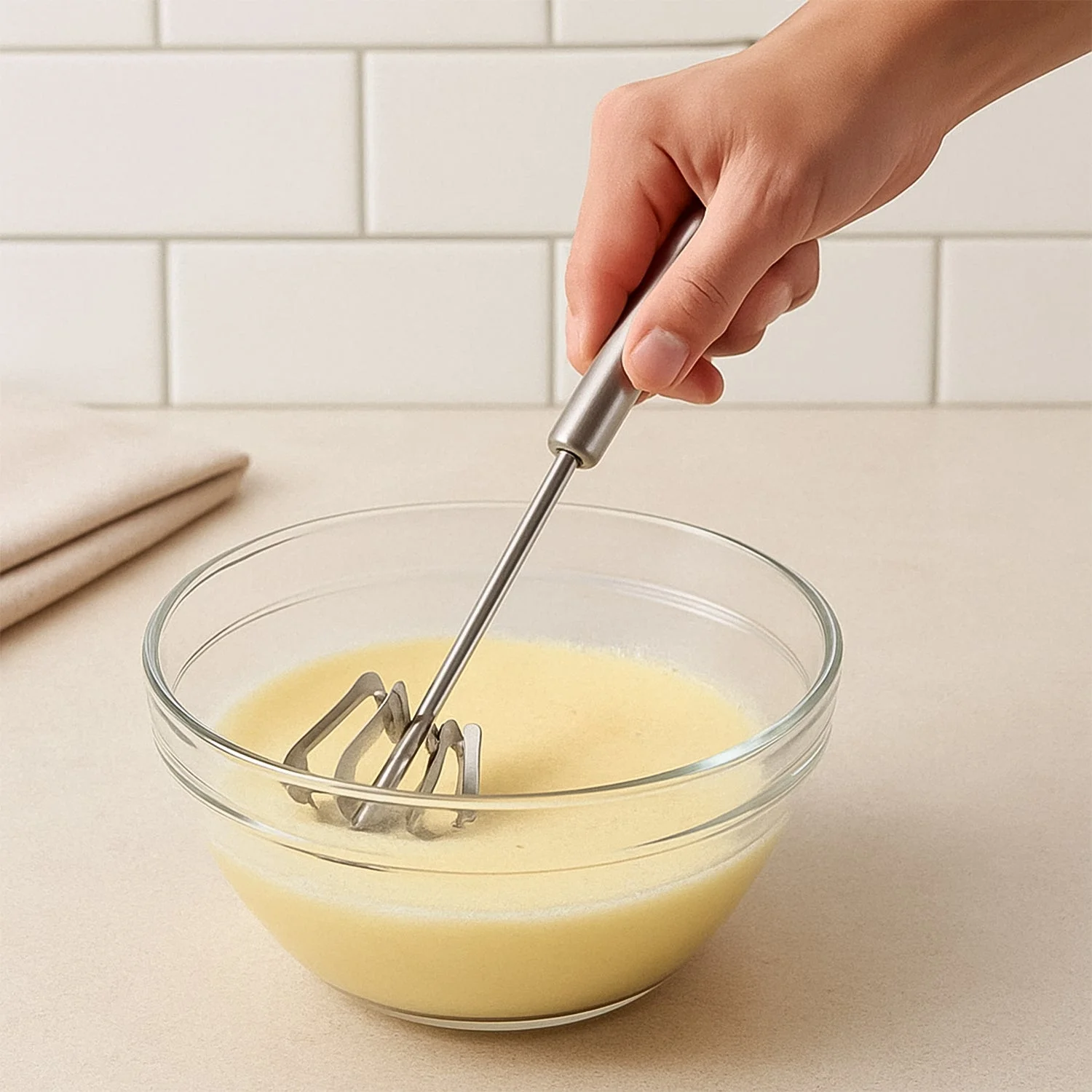 This Spring Whisk makes it easy to whisk eggs, cream, milk, and other liquids. All you have to do is press down, and the whisk will start spinning on its own, giving your mixes a smooth and creamy result. This design eliminates unnecessary hand movements and speeds up the whisking process so you can get to cooking.