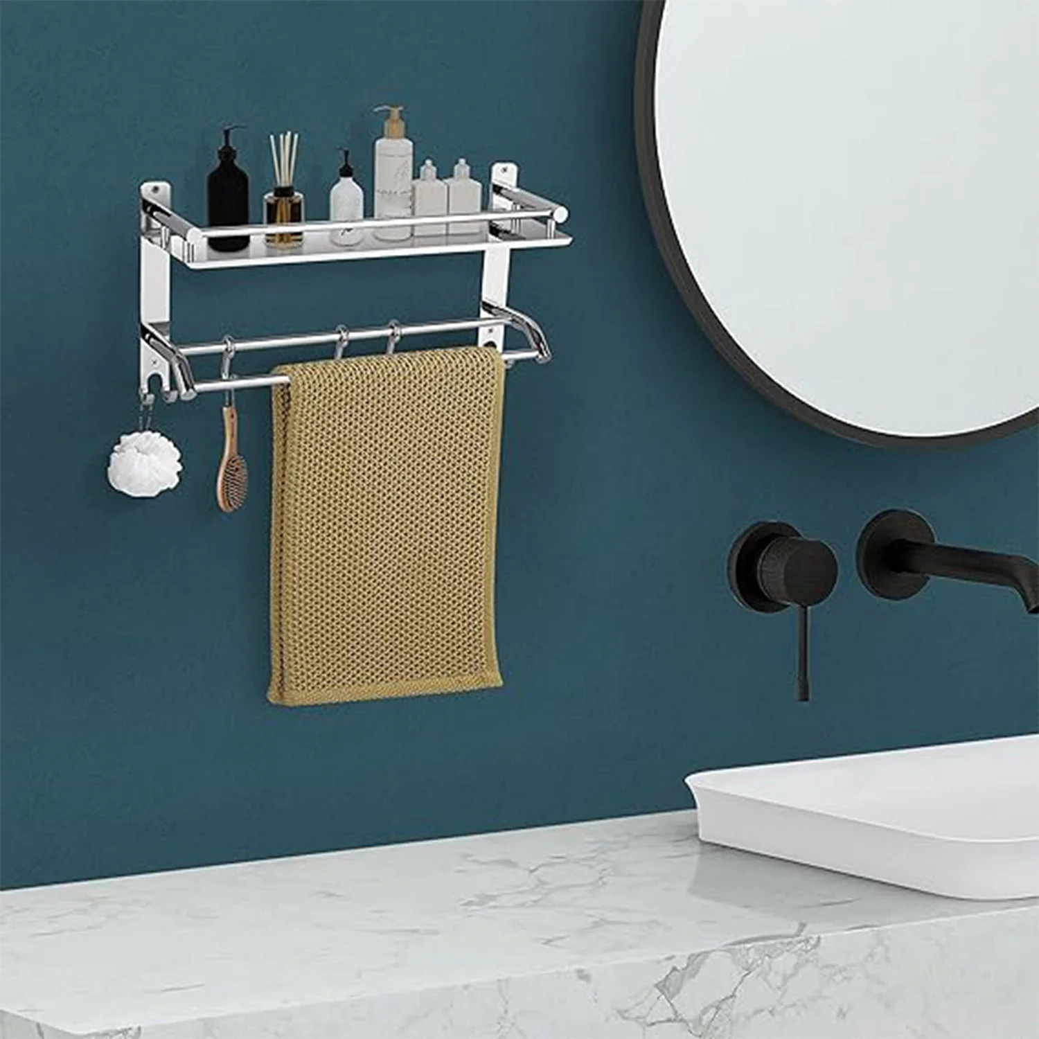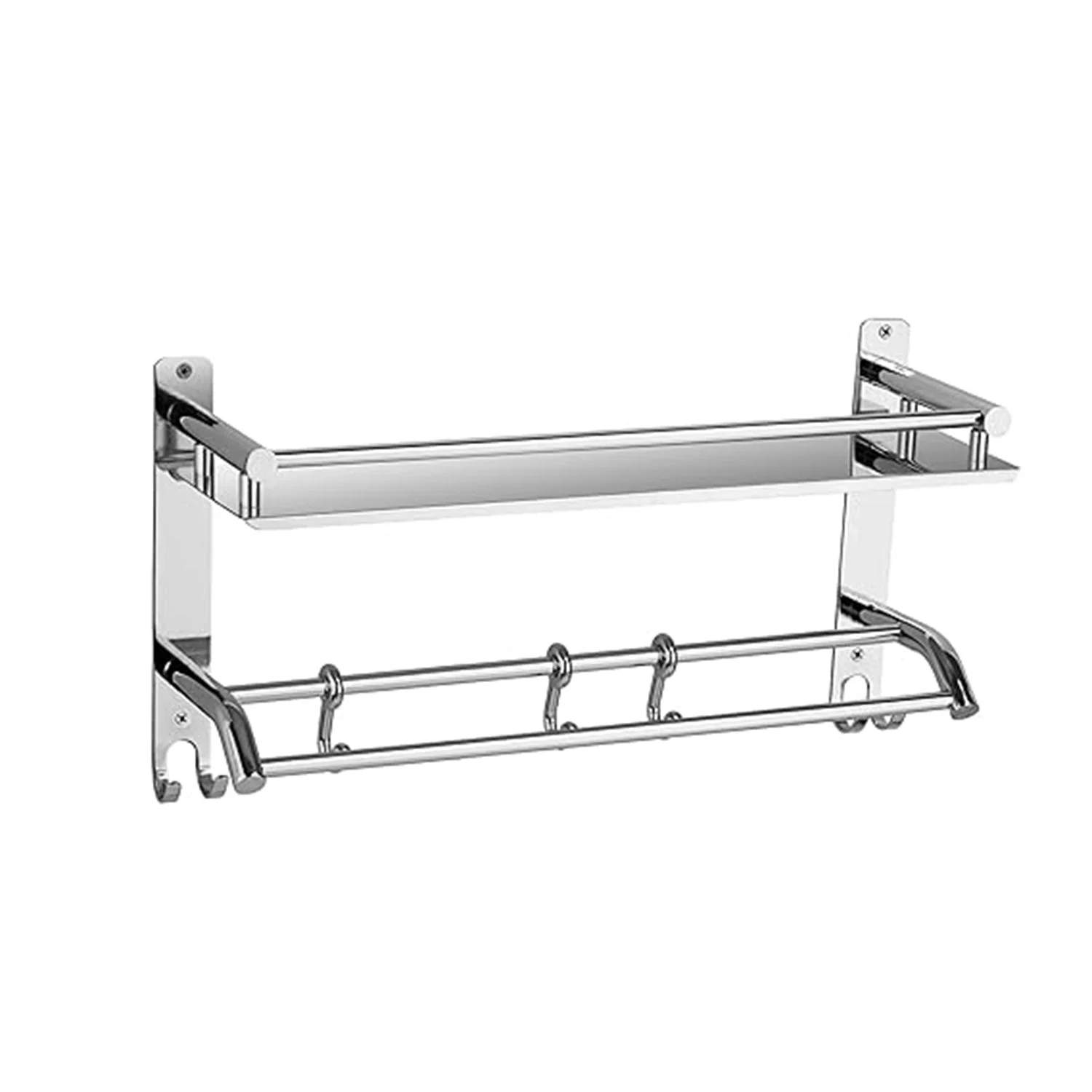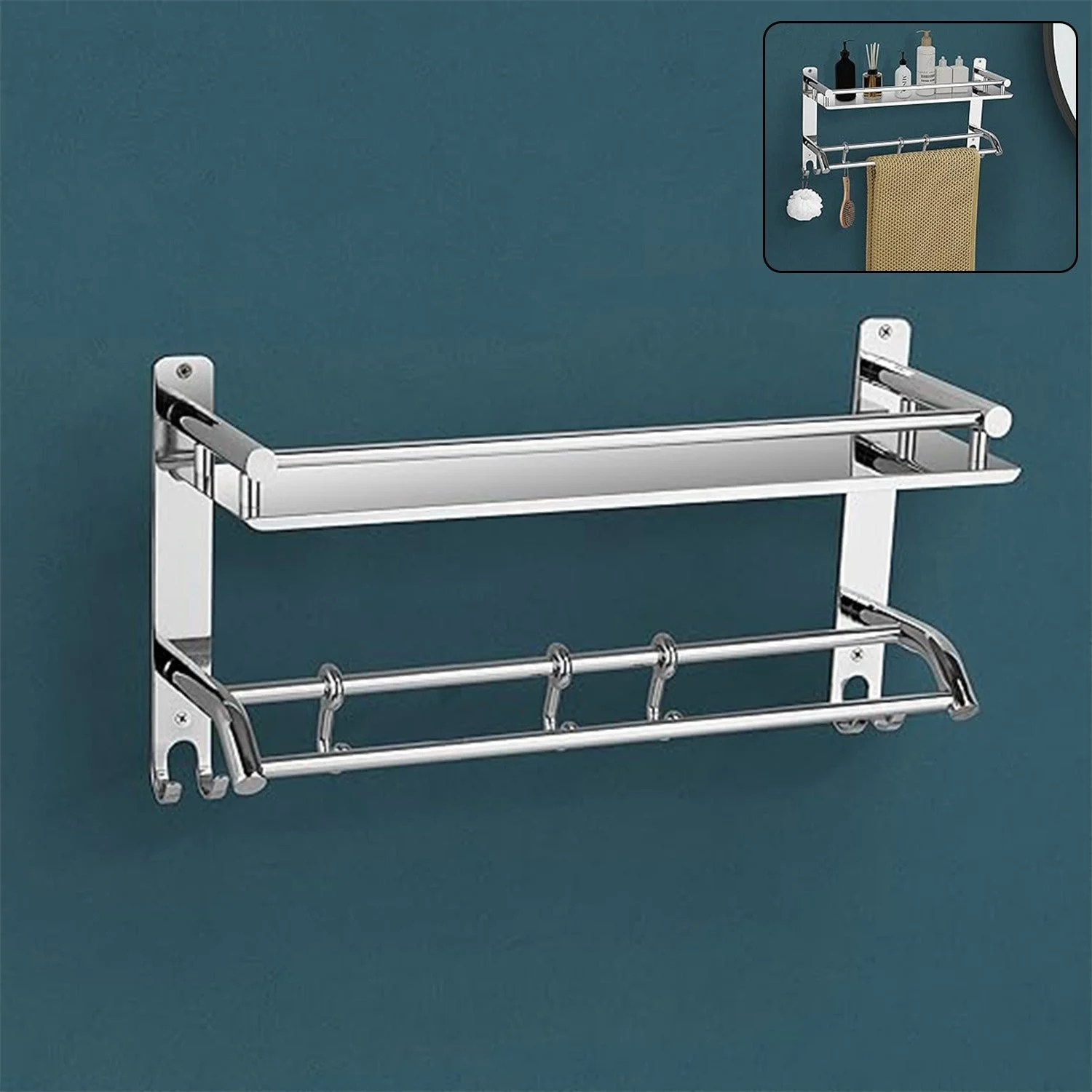 Stainless Steel Polished Wall-Mount Multipurpose 2 Tier Bathroom Shelf with Towel Holder (Chrome Finish)
