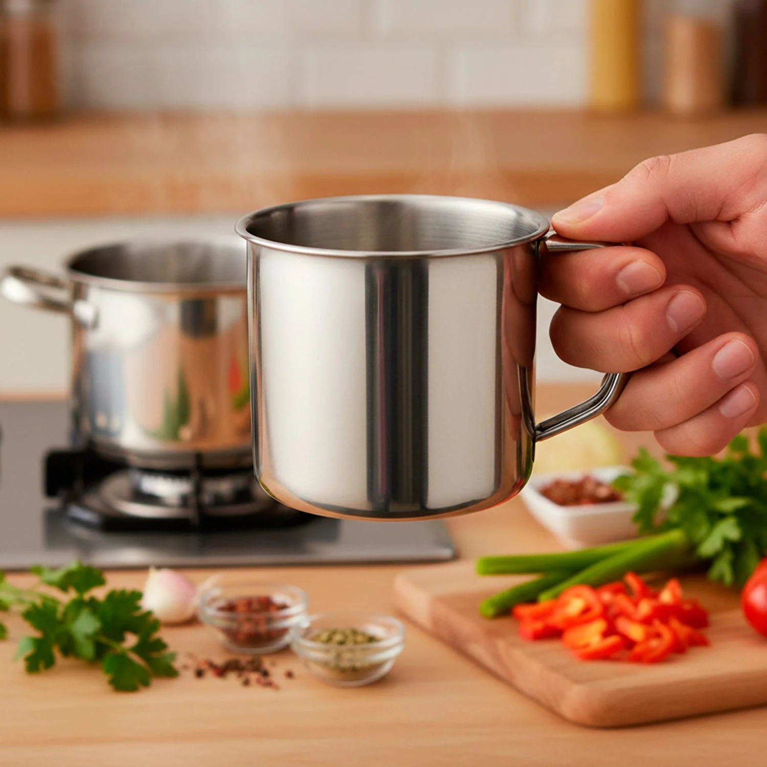 This stainless steel utility mug is designed for everyday beverage use at home as well as outdoor activities. Its sturdy build makes it suitable for serving hot or cold drinks while maintaining a simple and practical design. The strong side handle ensures a comfortable grip, making it easy to use during travel, camping, or office breaks. A versatile mug that fits seamlessly into daily routines and outdoor lifestyles.