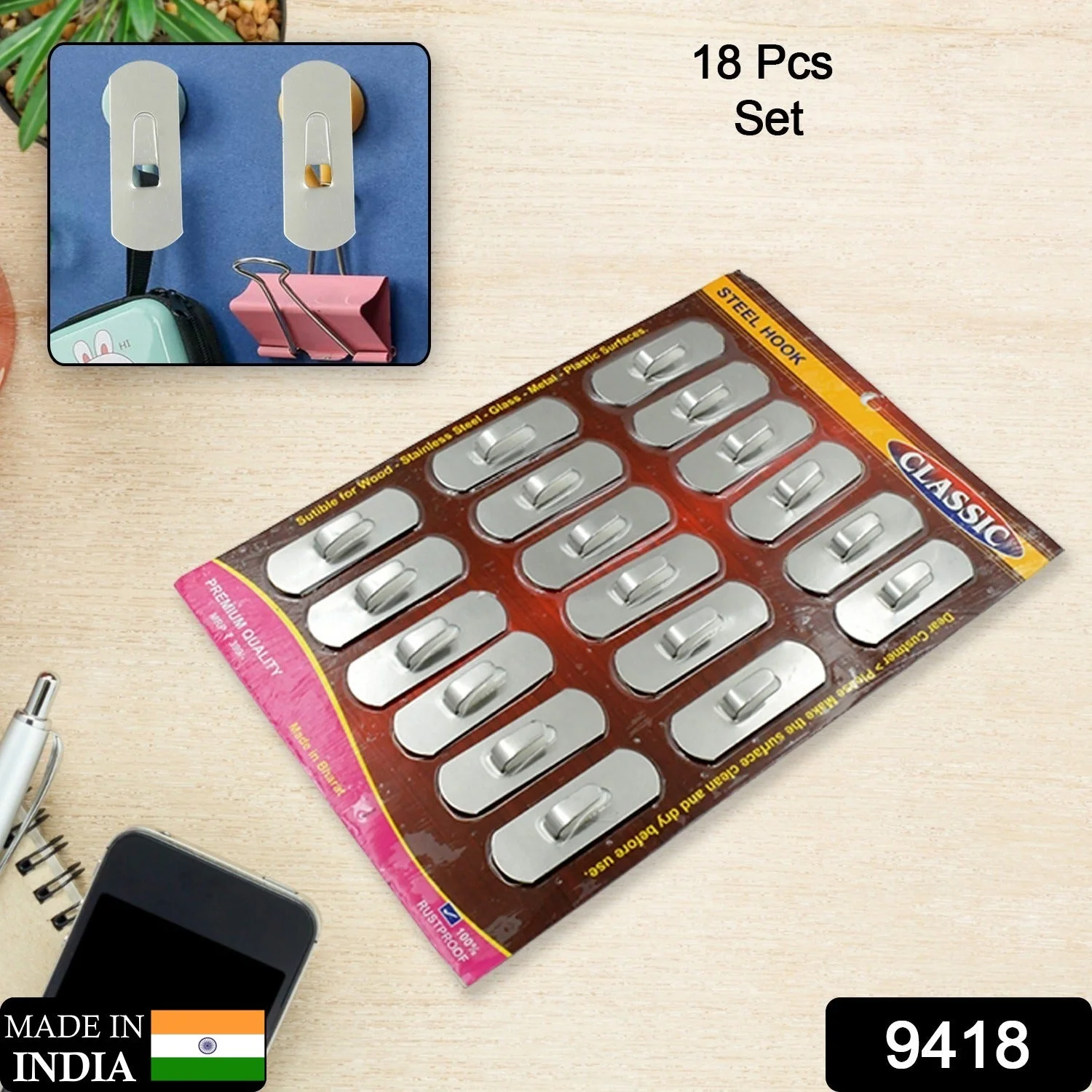 9418 Multipurpose Stainless Steel Wall hanging hook 18pc, Self Adhesive Stainless Steel Heavy Duty Wall Hooks for Hanging Clothes, Calender, Bathroom Tiles, Kitchen, Key Hange (18 Pc Set)