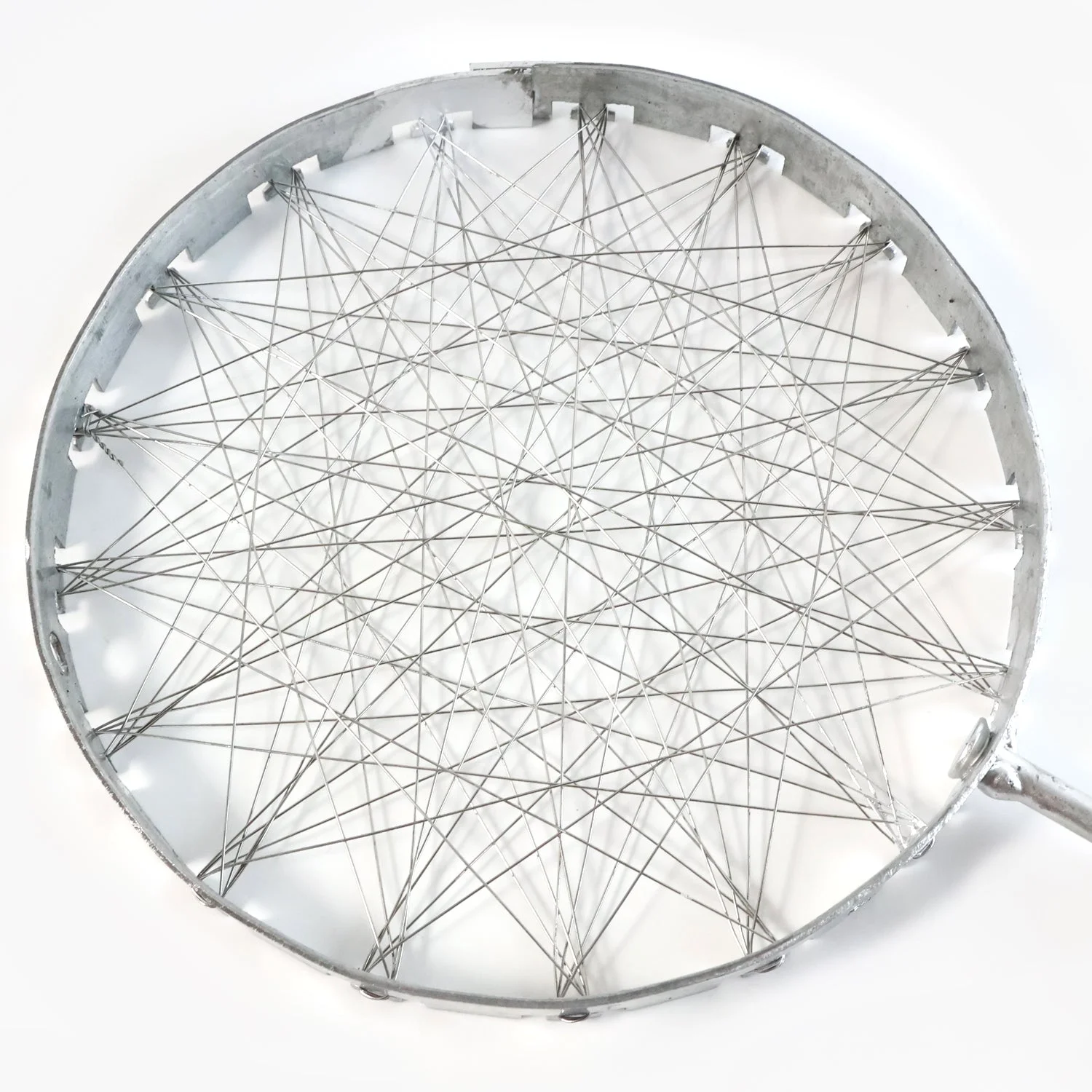 stainless steel wire skimmer, wire skimmer with wooden handle, tandoor style skimmer, oil strainer for frying, frying skimmer, grilling skimmer, kitchen cooking tool, wooden handle skimmer, heat resistant skimmer, tandur papad jali, roti jali, grill jali, barbeque jali, steel roaster