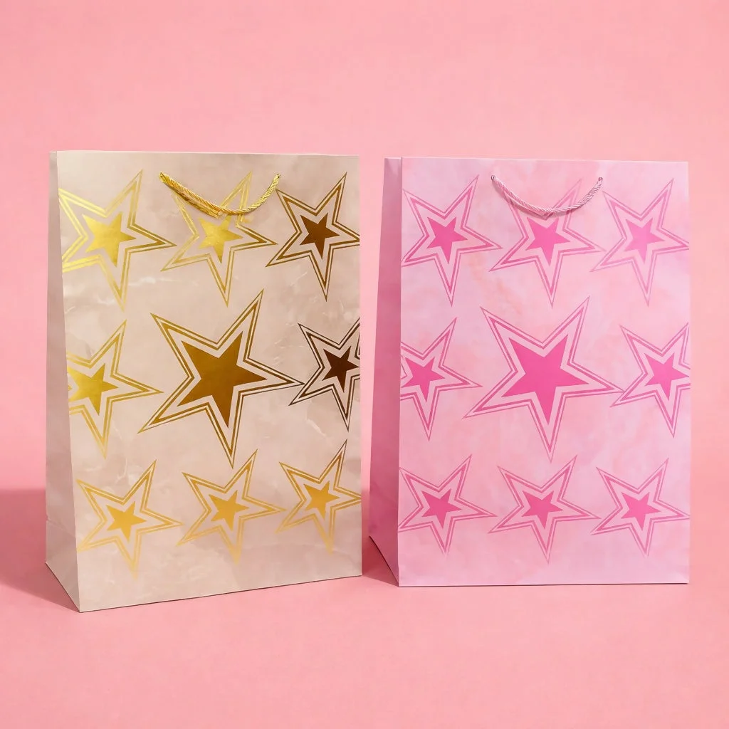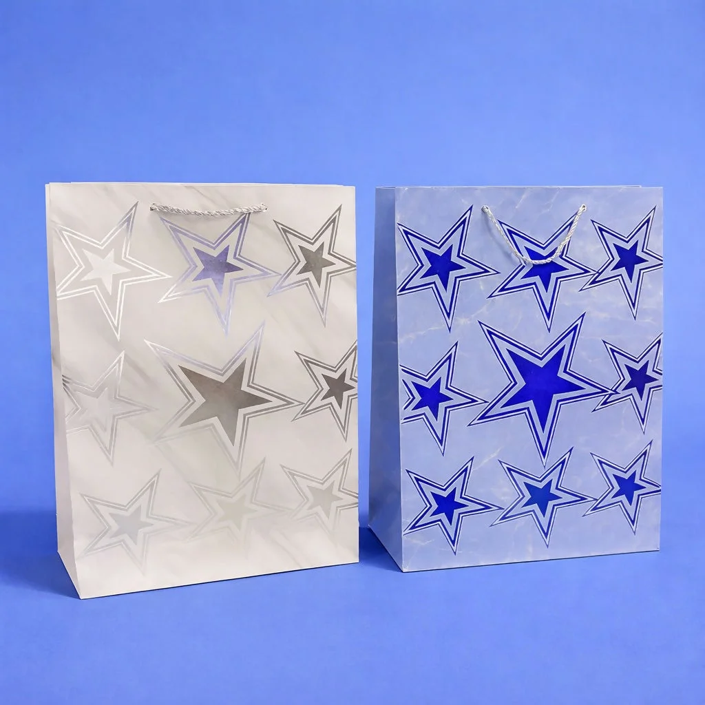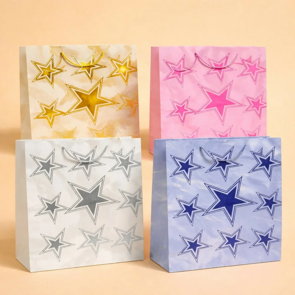 Make your gifts shine with this elegant star print paper gift bag featuring a stylish and modern design. Crafted with high-quality paper and sturdy rope handles, it ensures durability and easy carrying. The attractive star pattern adds a festive and premium touch, making it perfect for birthdays, celebrations, return gifts, and special occasions.