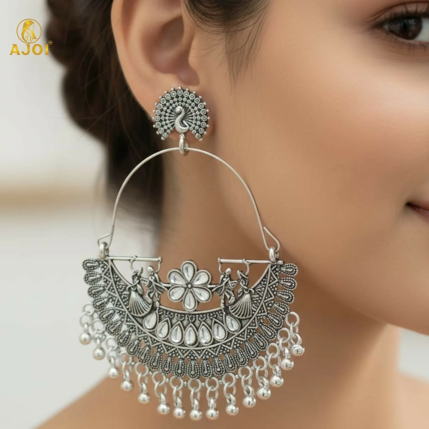 Make a bold and elegant style statement with these stunning oxidized silver peacock arch earrings. Designed with a beautifully detailed peacock-inspired stud, the earrings feature a graceful arch frame adorned with intricate floral and feather motifs. The finely crafted detailing and classic oxidized finish give these earrings a rich, heritage-inspired look.