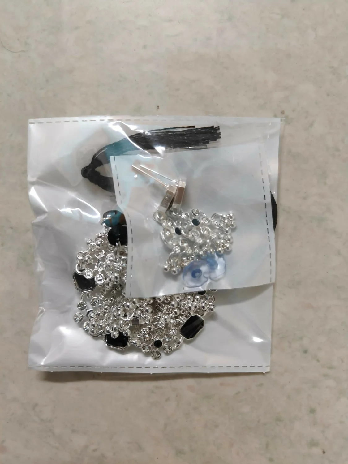 Earrings: The earrings are a complementing chandelier or drop style, featuring a small stud connected to a dangling cluster of the intricate silver-toned work, similar to the necklace motifs, and often including a central black stone accent.