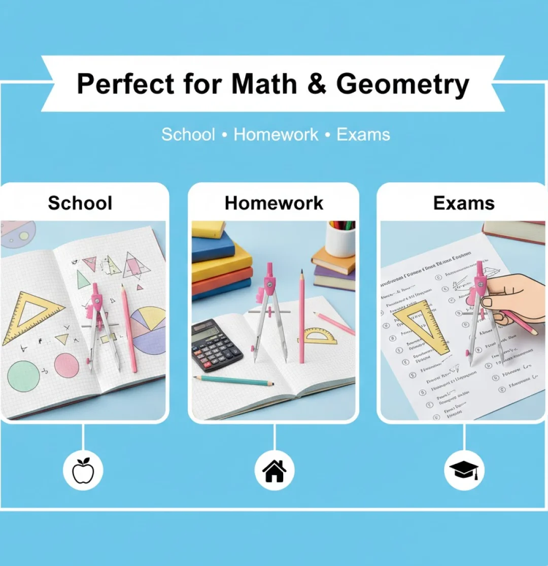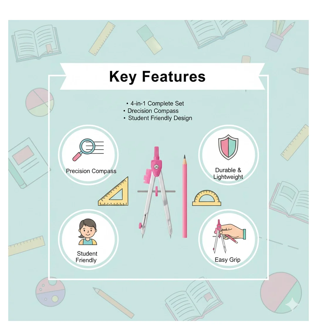 This 4-in-1 Geometry Compass Set is a complete tool kit for students, school children, and aspiring designers. Designed for precision, ease, and portability, the set includes a sturdy metal-leg compass, a mechanical pencil for smooth drawing, a refillable lead case, and a durable transparent plastic case to store everything securely.