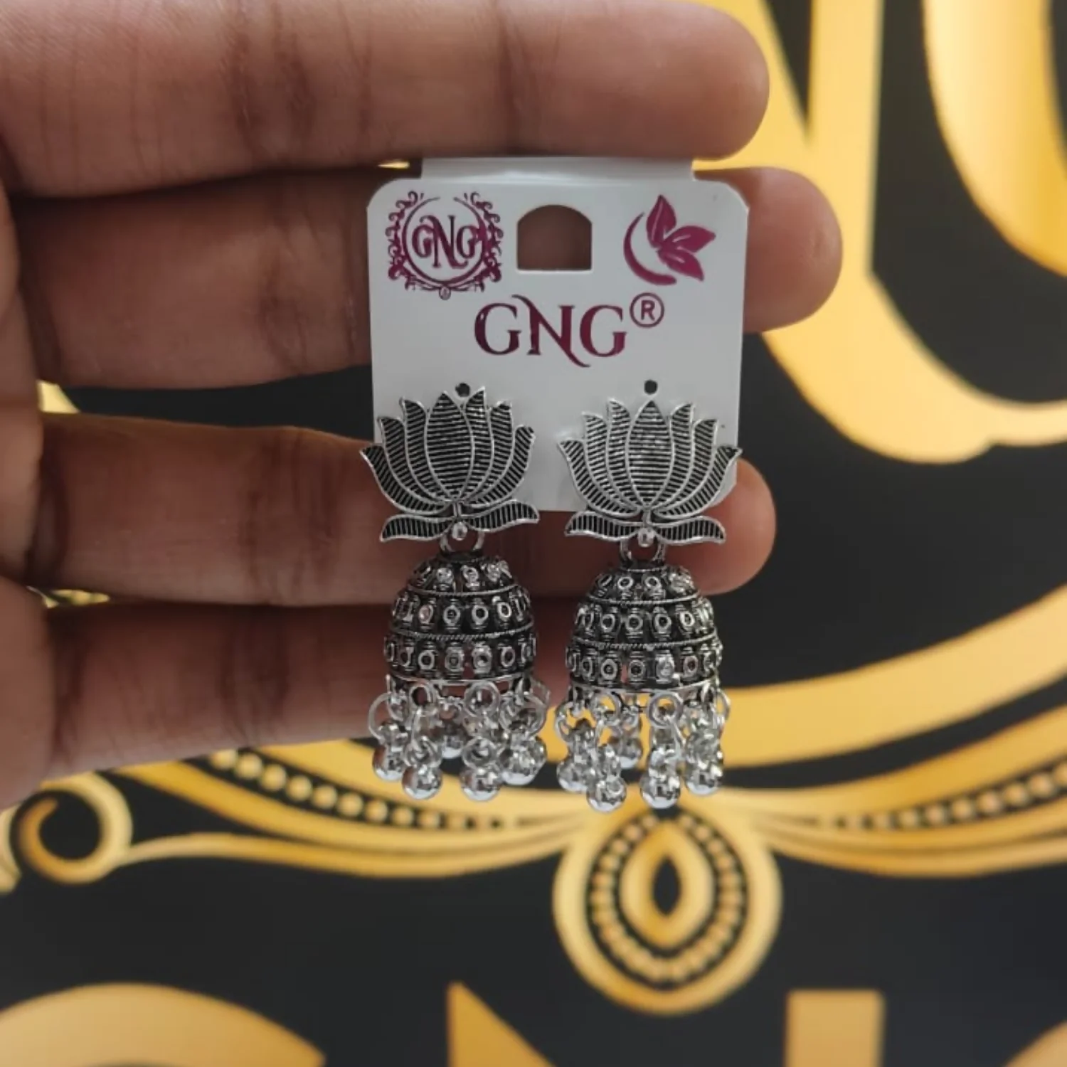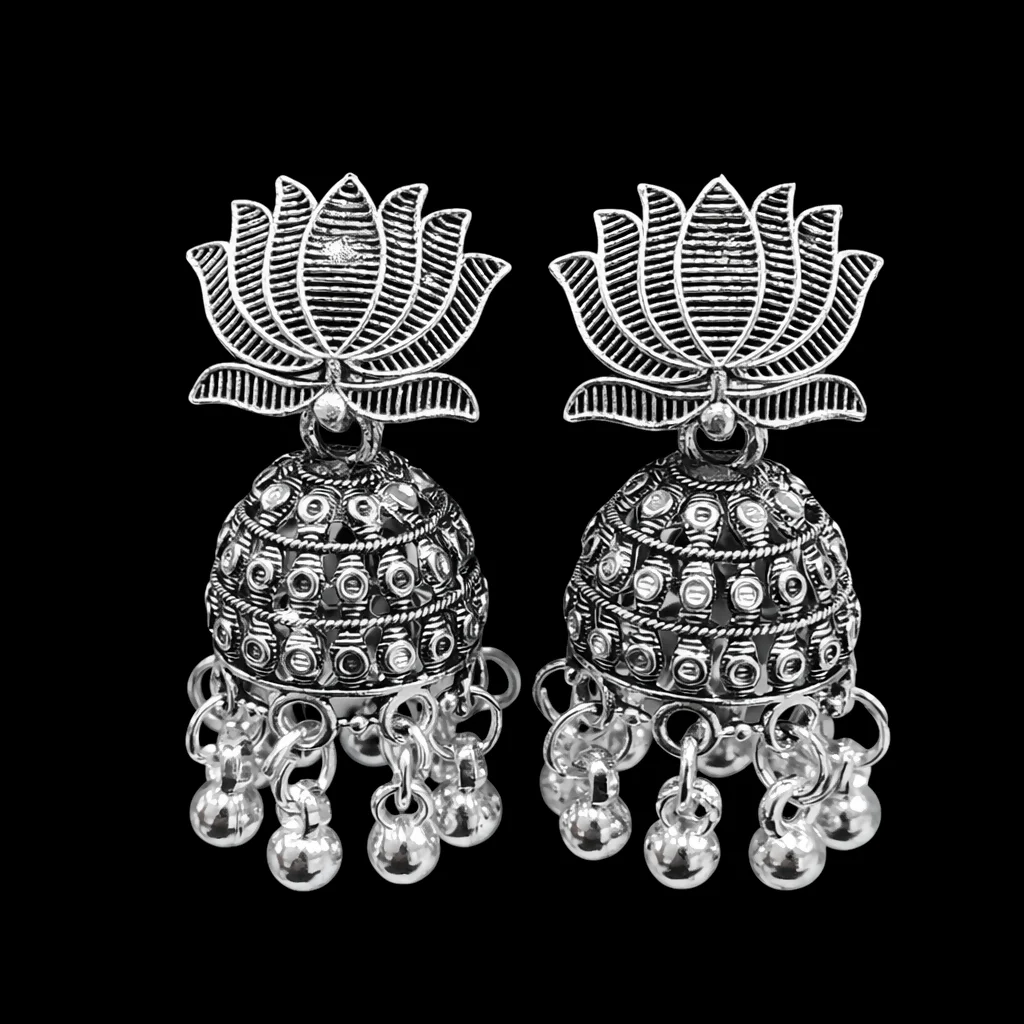 This stunning pair of oxidised silver lotus jhumka earrings features an elegant lotus motif at the top with finely detailed traditional jhumka work below. Crafted with a rich oxidised finish, the intricate patterns and dangling ghungroo beads create a graceful ethnic look. Lightweight and comfortable, these earrings are ideal for festivals, weddings, pooja functions, and everyday traditional wear. Their timeless design pairs beautifully with sarees, kurtis, lehengas, and Indo-western outfits, making them a perfect addition to any jewellery collection.