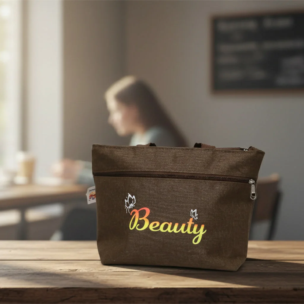 Stylish Design – Denim-style fabric with colorful “Beauty” and decorative floral accents.