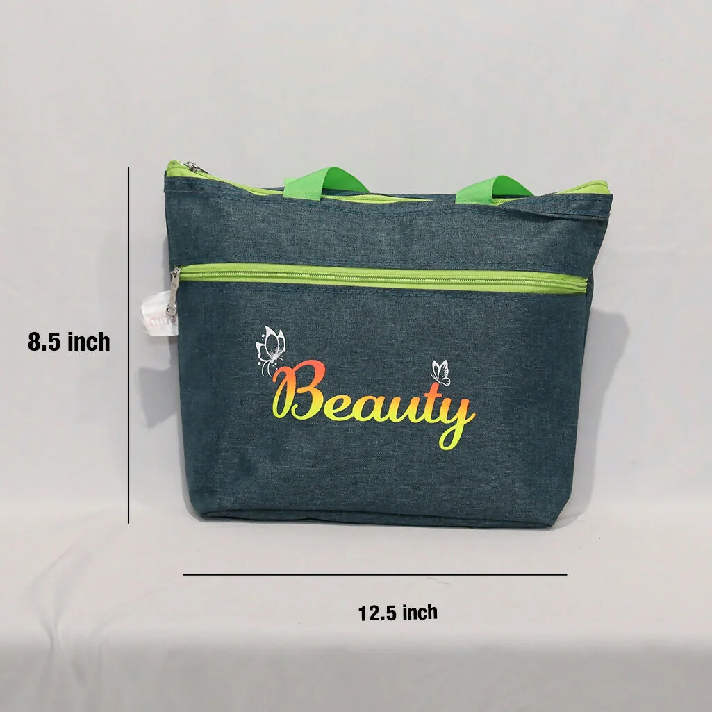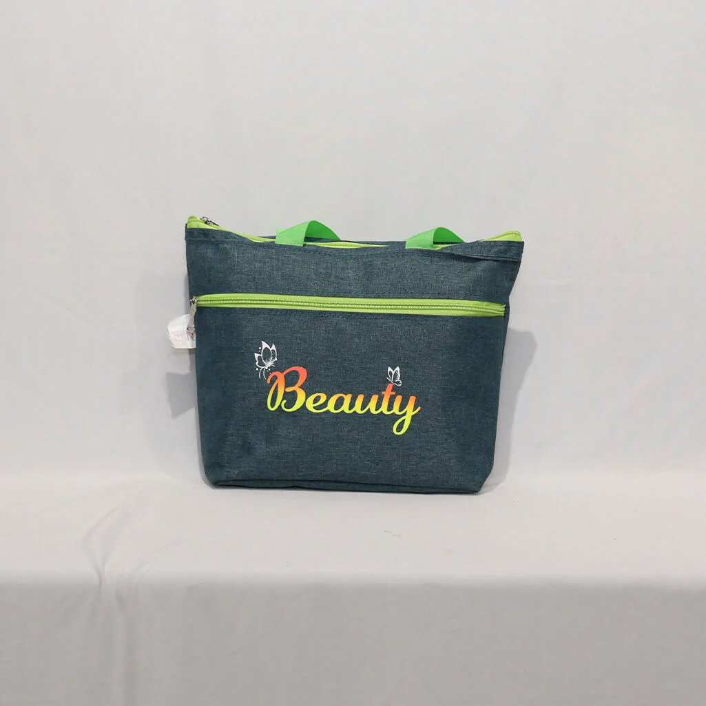 Carry your essentials in style with this beautifully designed denim shopping tote bag. Featuring vibrant green handles, a smooth front zipper pocket, and colorful “Beauty”, this reusable bag is perfect for everyday use. Its durable fabric construction makes it ideal for shopping, travel, work, school, or casual outings. Lightweight, spacious, and easy to clean, it's the perfect blend of practicality and fashion.