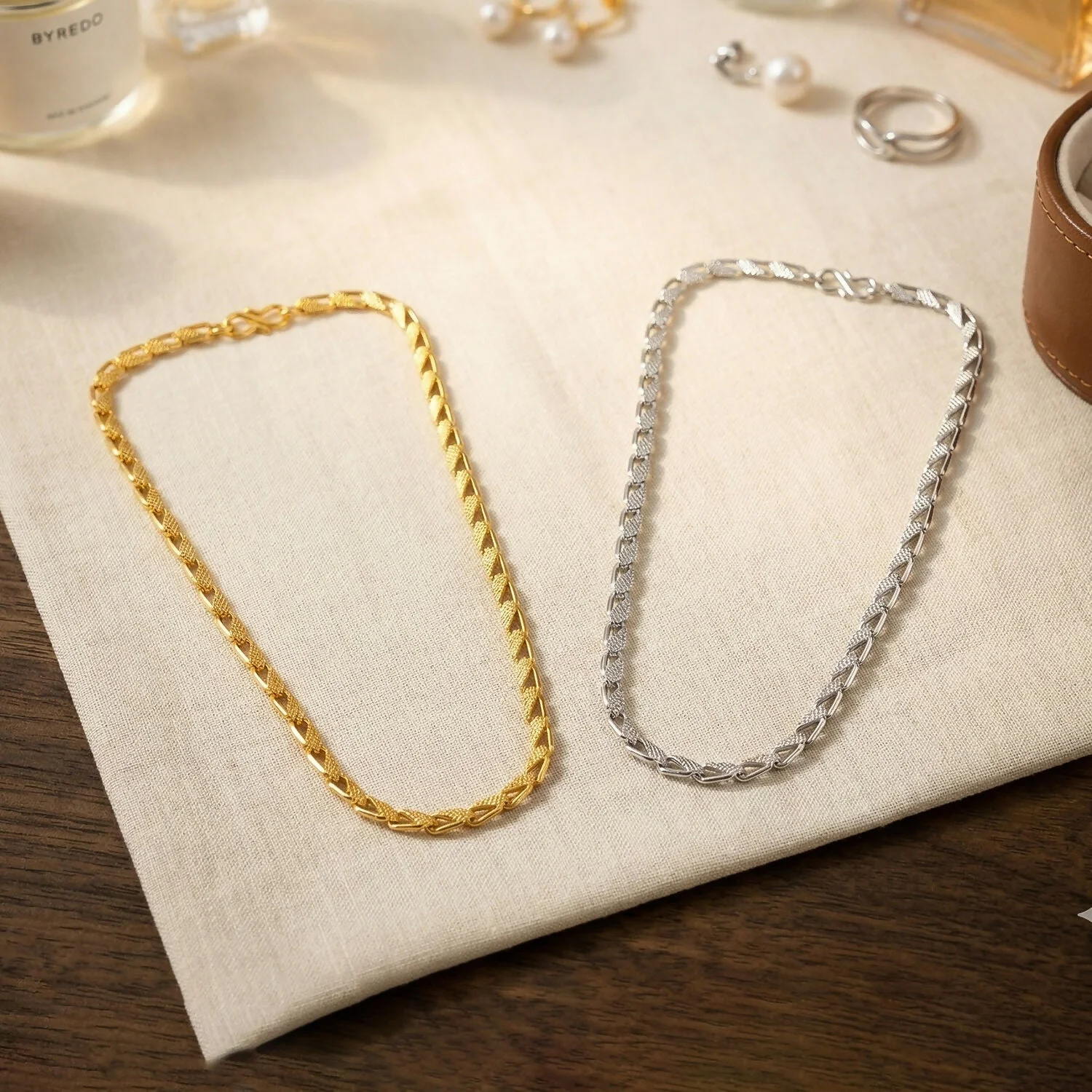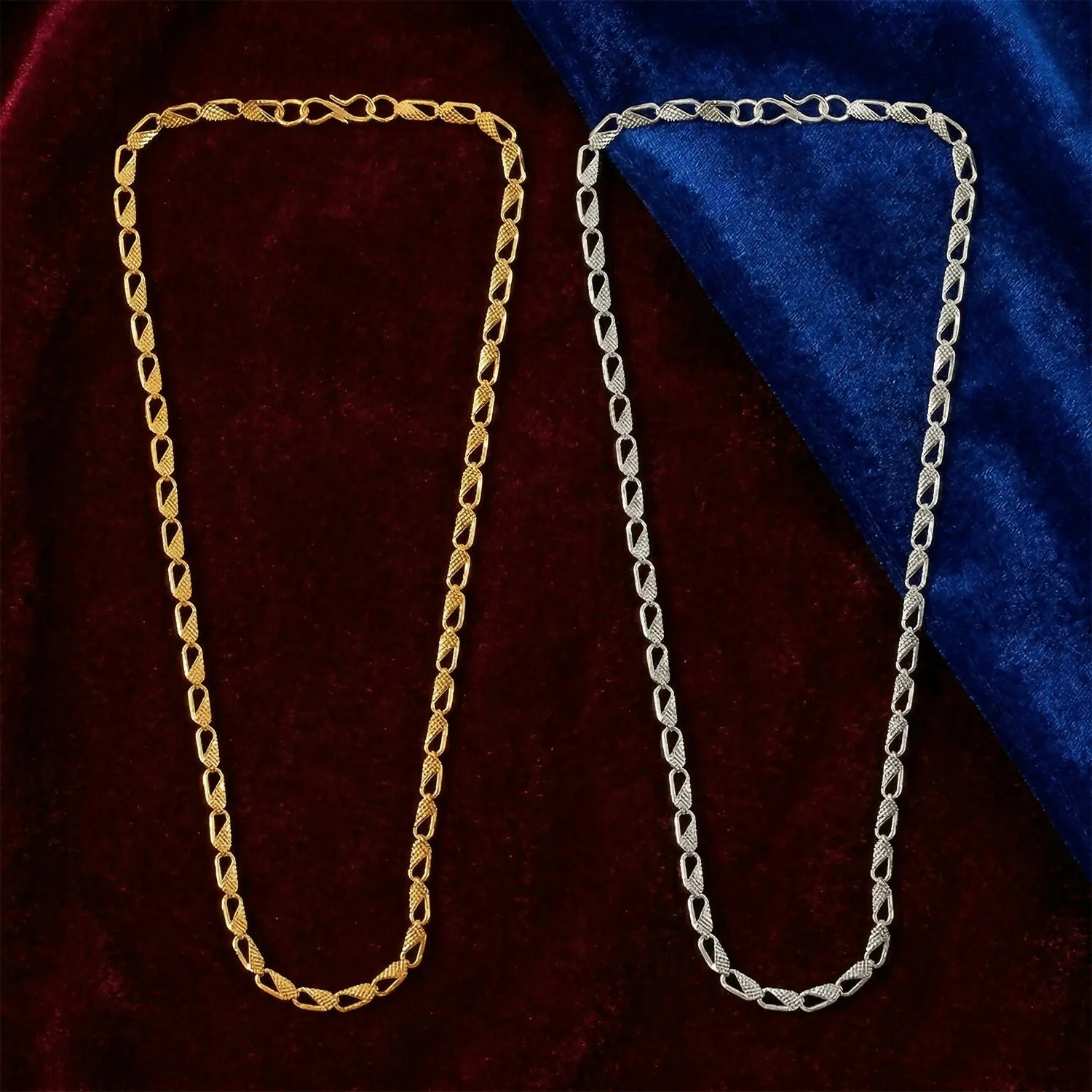 Upgrade your everyday style with this trendy dual-tone designer chain necklace crafted for a bold and modern look. Featuring an elegant interlocking pattern, this chain is available in both gold and silver finishes, giving you versatile styling options for different occasions.