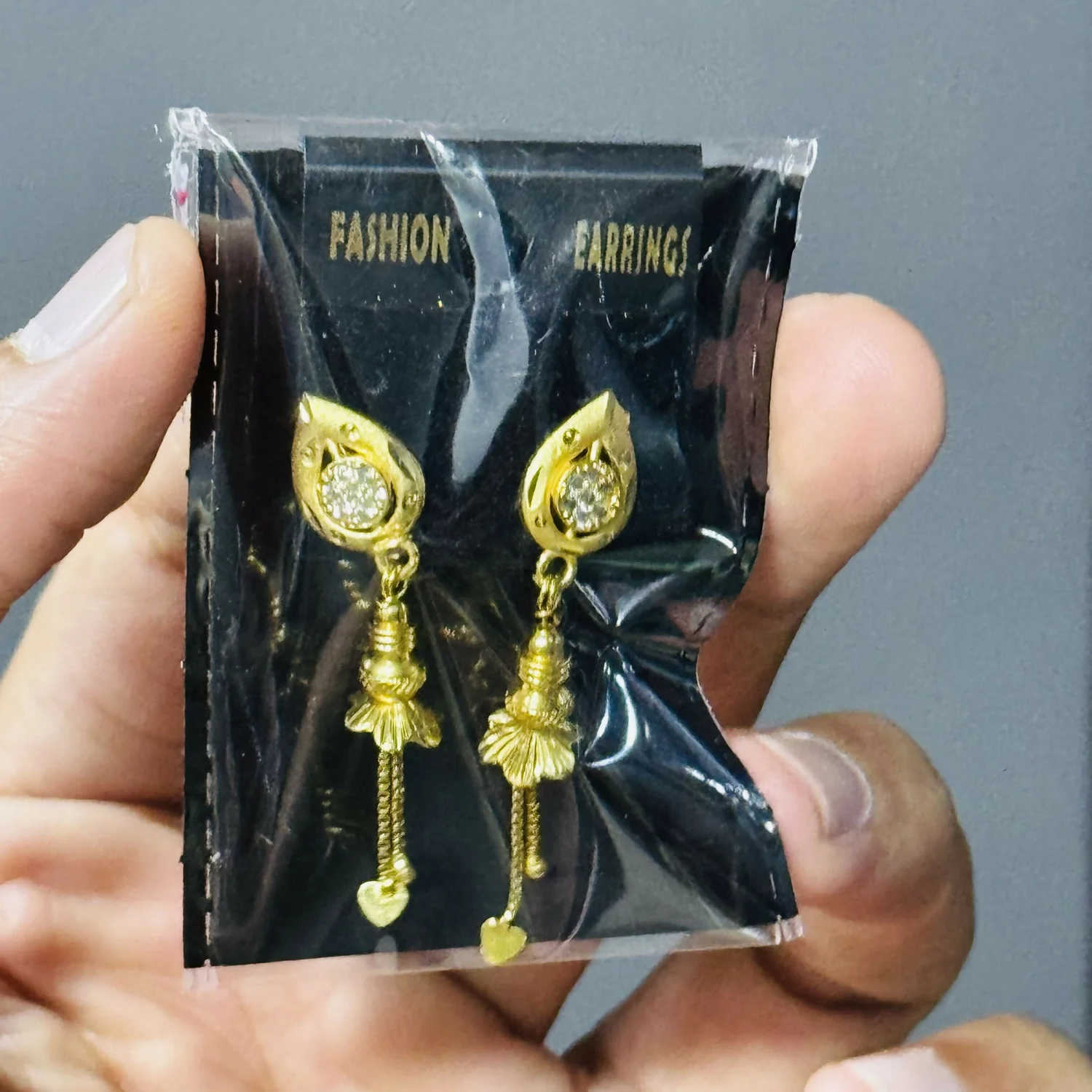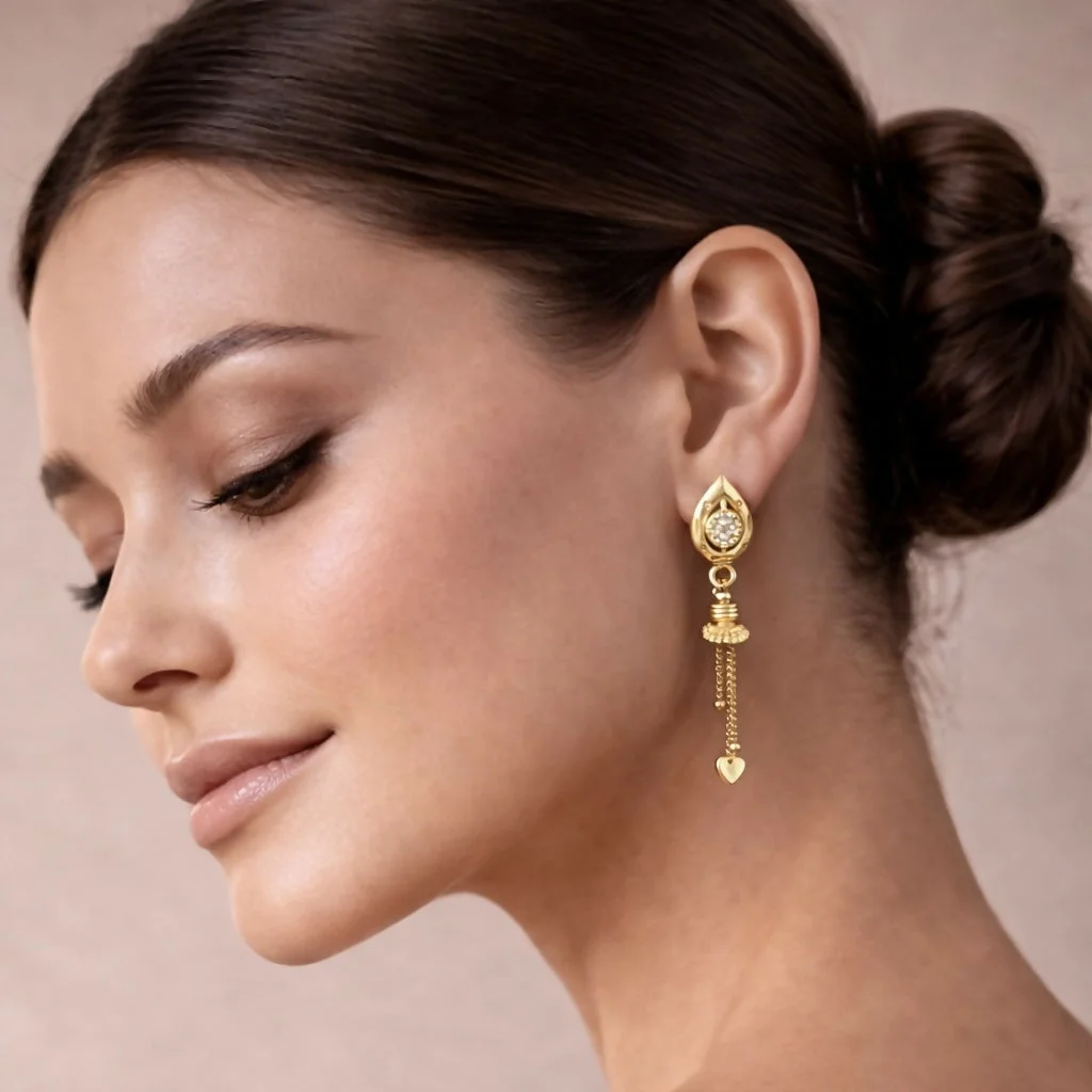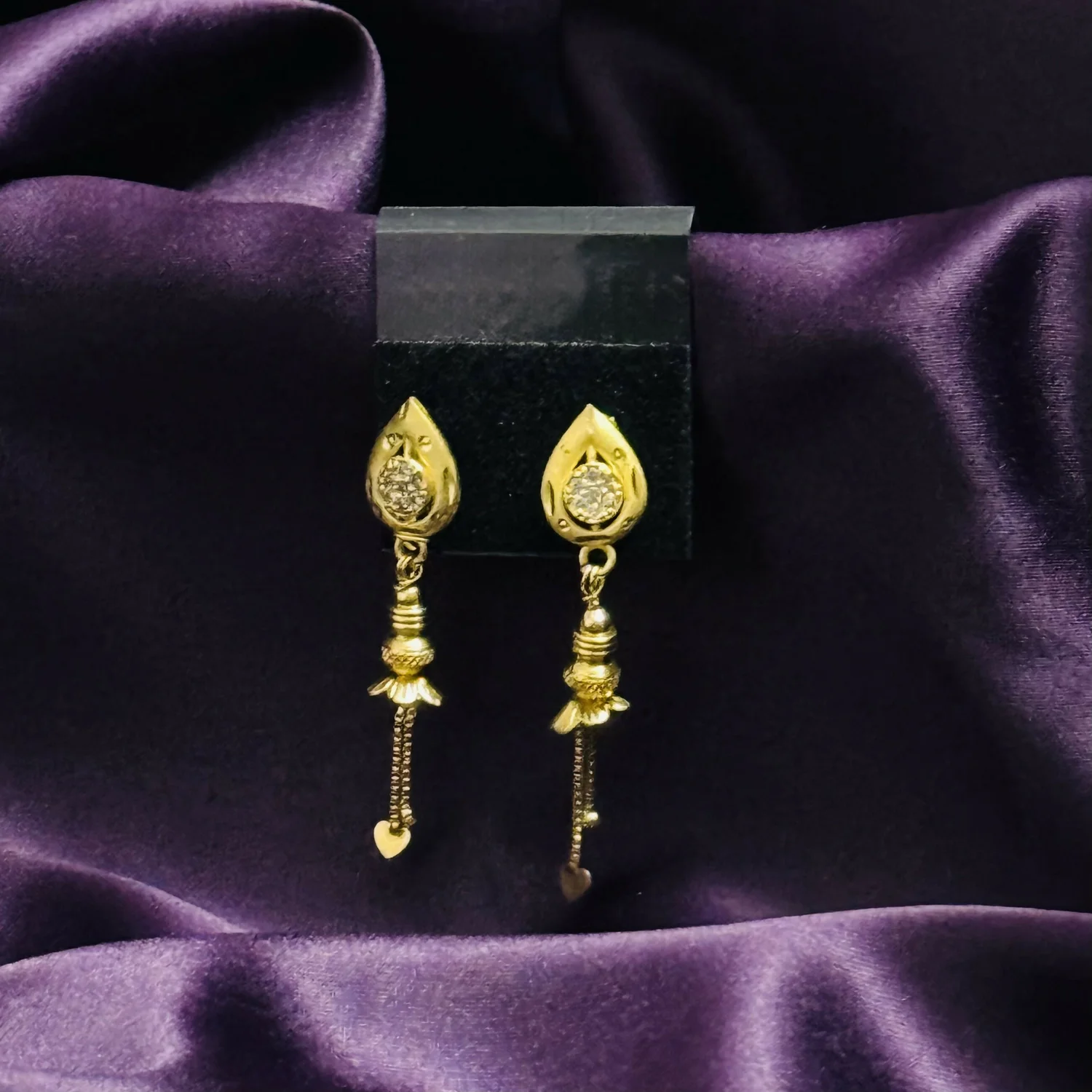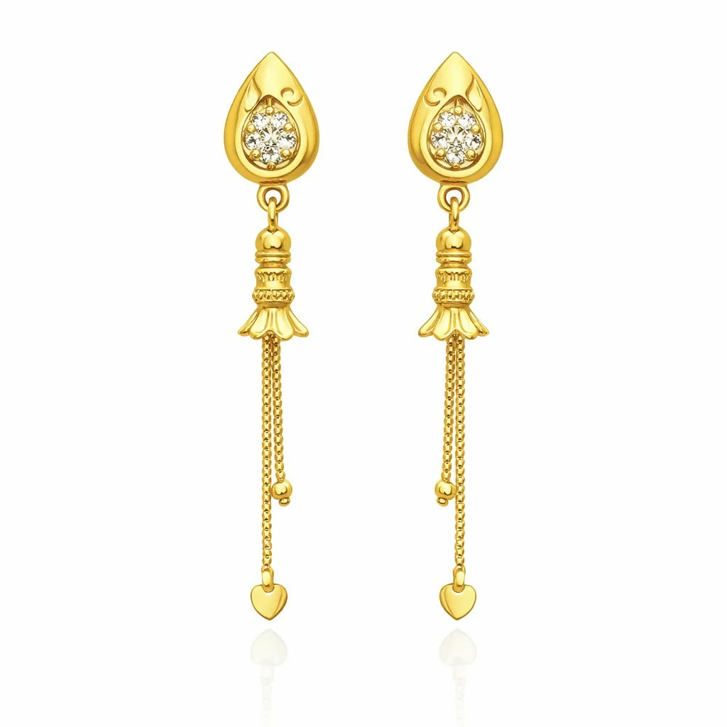 Elegant and timeless, these gold dangle earrings feature a refined teardrop-shaped top adorned with a sparkling stone at the center, creating a subtle yet eye-catching brilliance; the smooth polished gold finish enhances their luxurious appeal, while the intricately crafted hanging elements add graceful movement and delicate charm with every step; designed to be lightweight and comfortable, they are perfect for extended wear and secured with a sturdy stud backing for a reliable fit; the fine detailing and balanced design make these earrings versatile enough to complement both traditional attire like sarees and lehengas as well as modern outfits, making them an ideal choice for festive occasions, weddings, parties, or everyday elegance; a perfect blend of sophistication and craftsmanship, these earrings also make a thoughtful gift option, offering durability, style, and a classic aesthetic that never goes out of fashion.