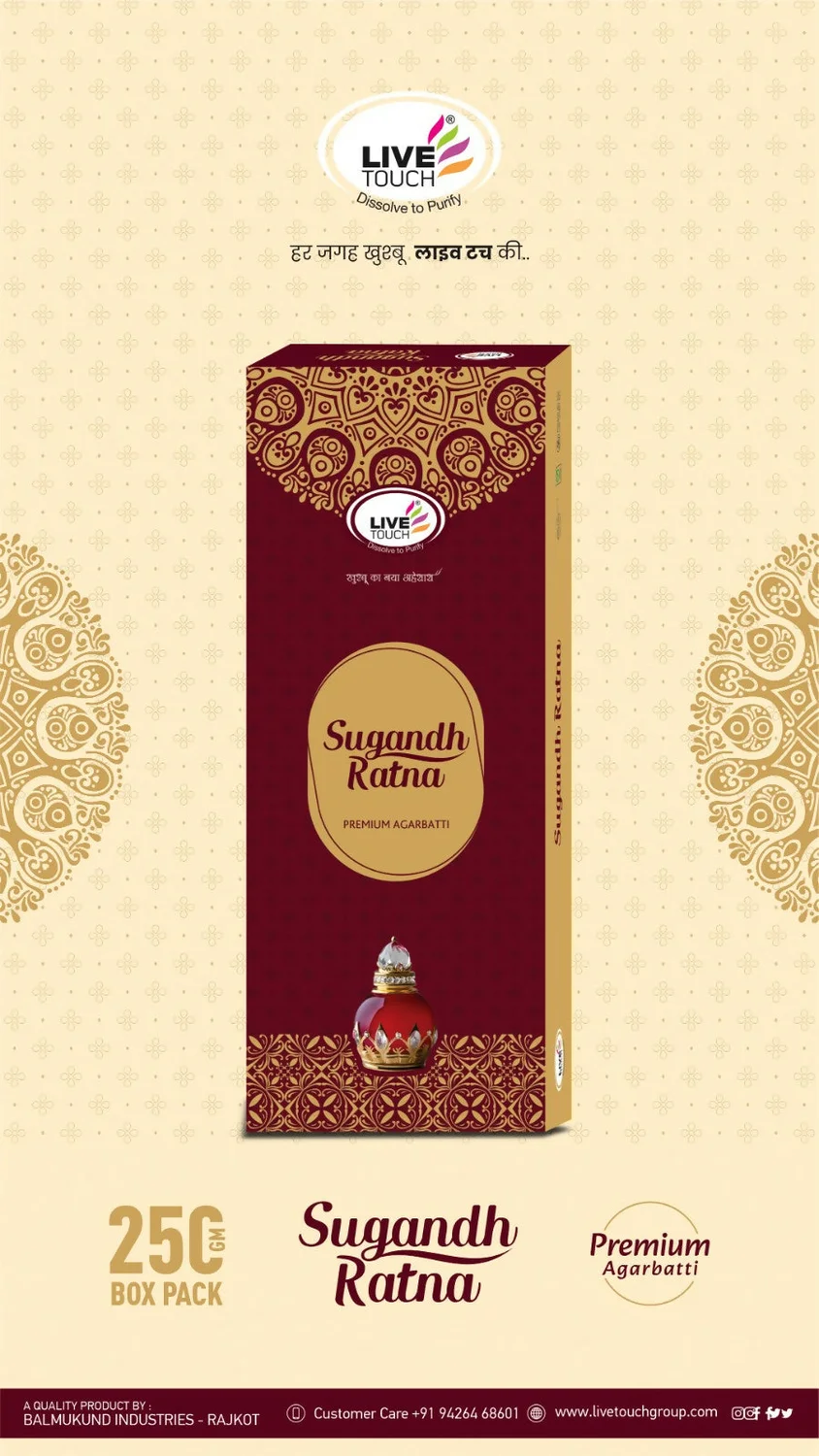 Elevate your spiritual rituals and everyday ambiance with Live Touch Sugandh Ratna Premium Agarbatti. Crafted with a luxurious blend of traditional aromatic ingredients, this premium incense offers a soulful, long-lasting fragrance that soothes the mind and uplifts the environment. Ideal for daily puja, meditation sessions, festive celebrations, or simply refreshing your home, each stick is designed to burn smoothly and evenly, releasing a divine aroma that lingers for hours.
