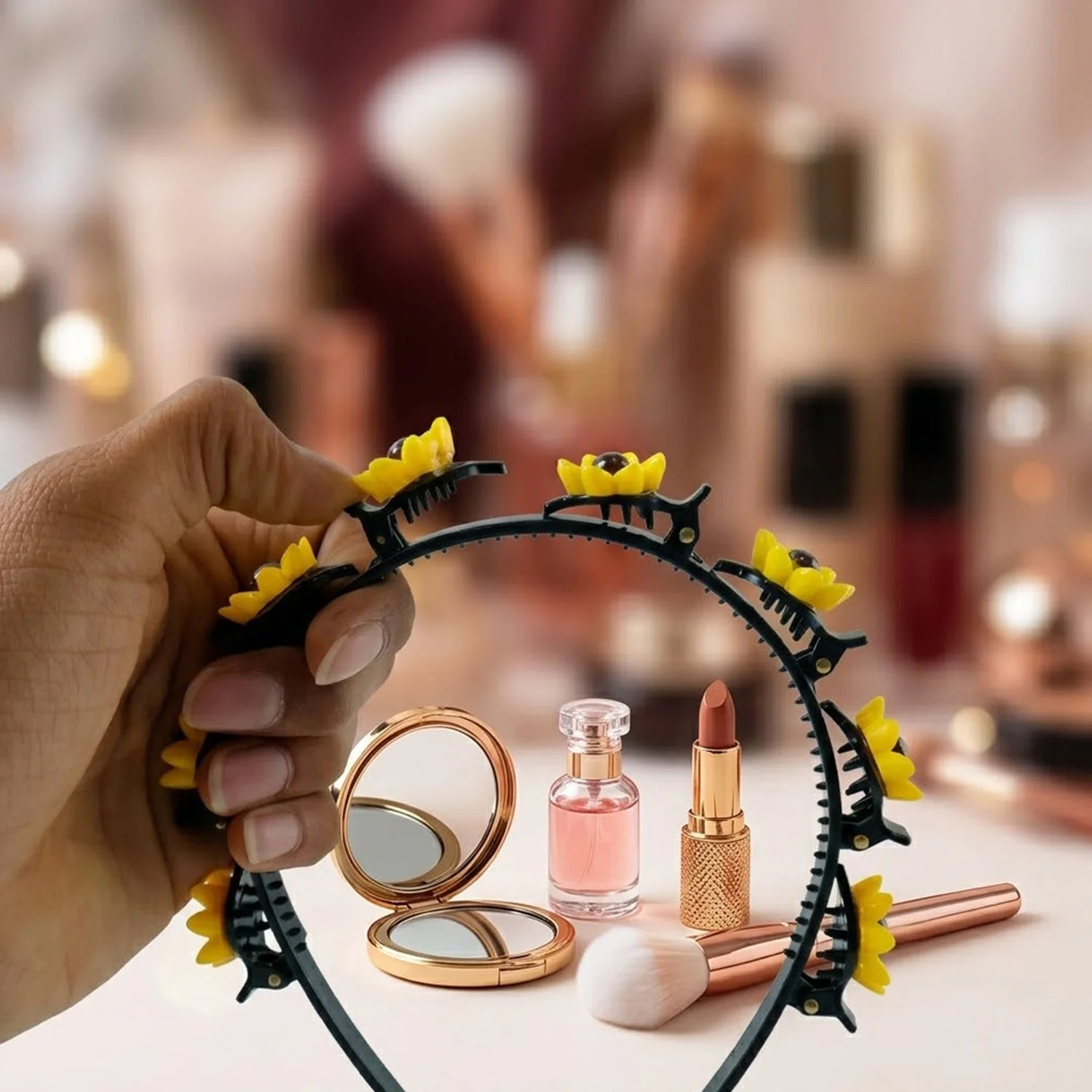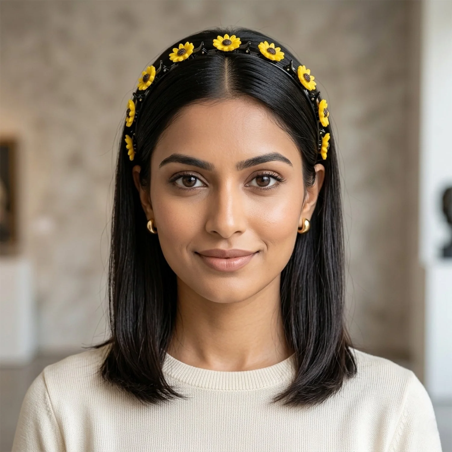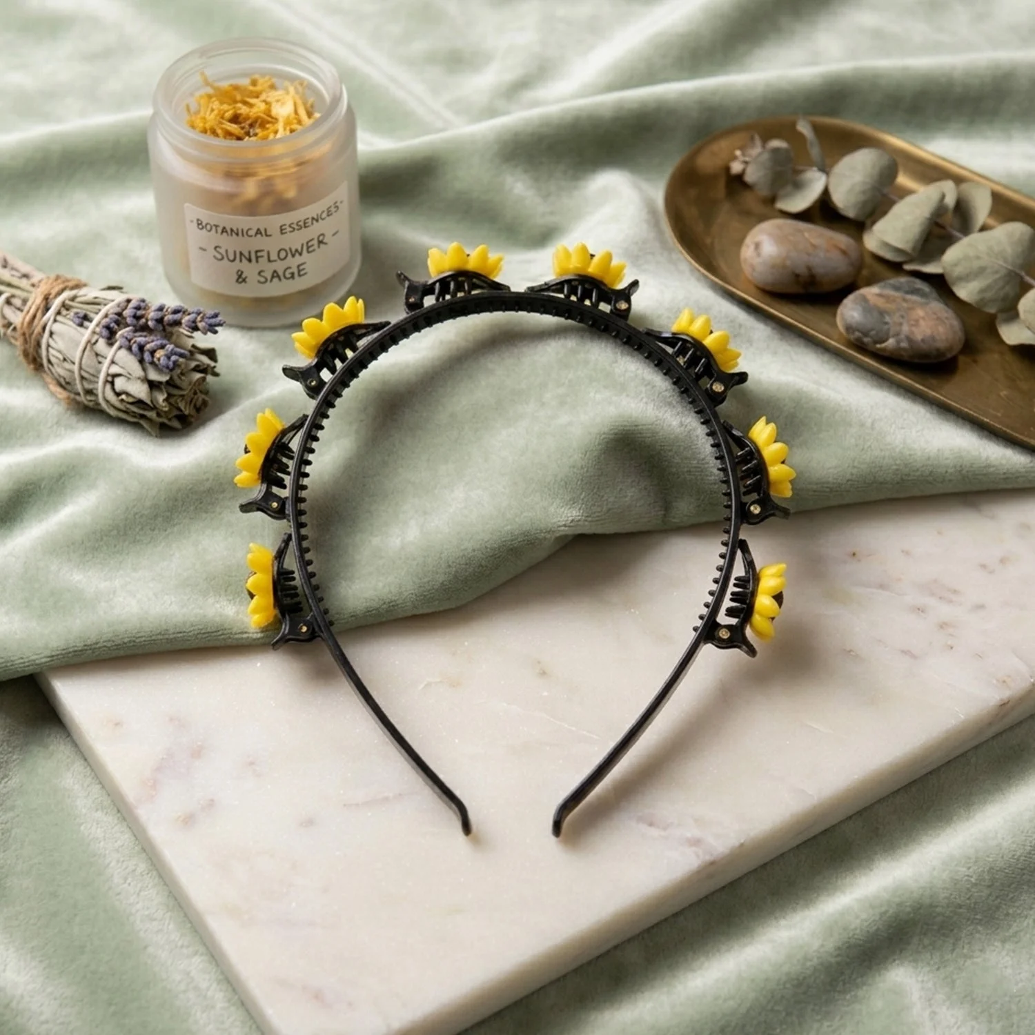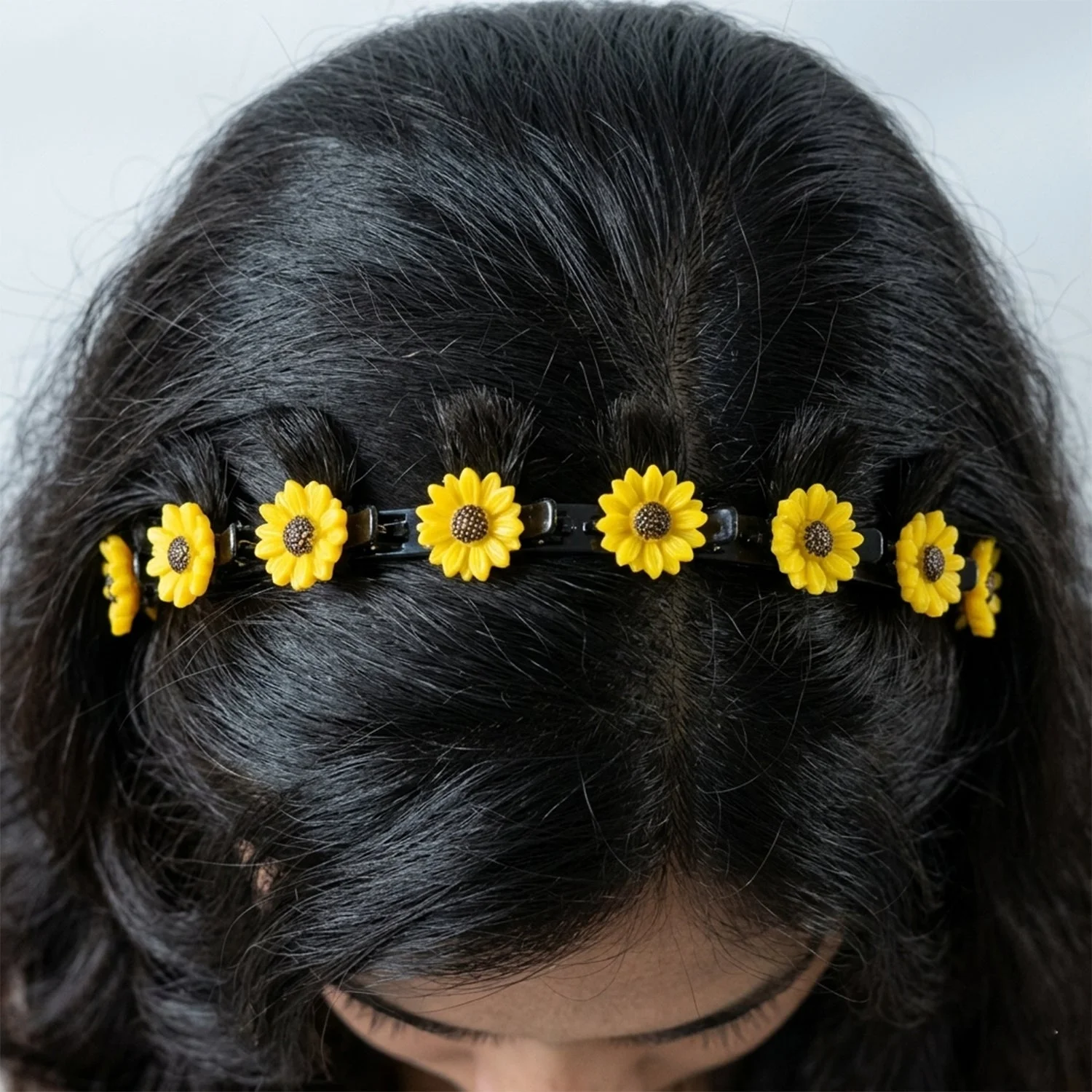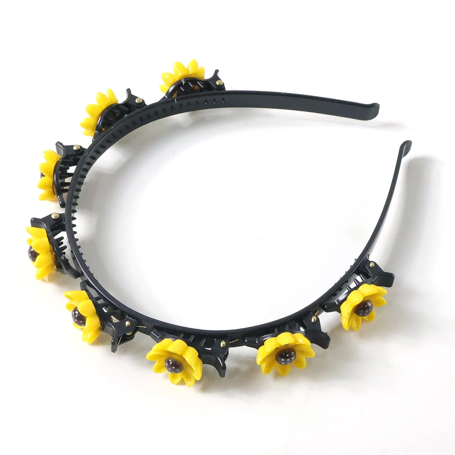 sunflower hair band, sunflower headband, floral clip hair band, sunflower design headband, sunflower hair accessory, floral headband for women, sunflower hair clips, multi sunflower headband, claw clip hair band, built in clip headband, non slip hair band, secure grip headband, decorative hair band, stylish floral headband, girls hair accessories, womens hair band, party wear headband, festive hair accessory, cute sunflower hair band, yellow flower headband, boho floral headband, trendy hair band