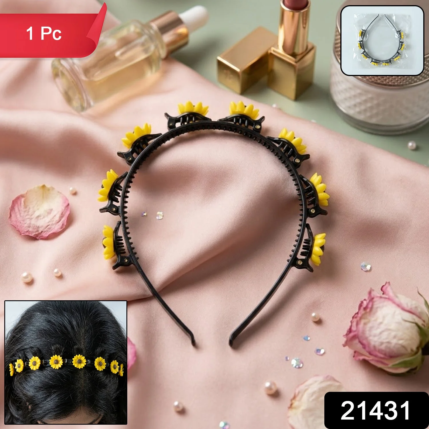 Managing hair while maintaining a stylish look can be challenging for everyday wear. The Sunflower Design Floral Clip Hair Band adds charm while keeping hair neatly in place. This sunflower hair band blends beauty and function with its floral clip hair accessory design. Ideal as a decorative hair band for women, it enhances both casual and festive looks effortlessly.