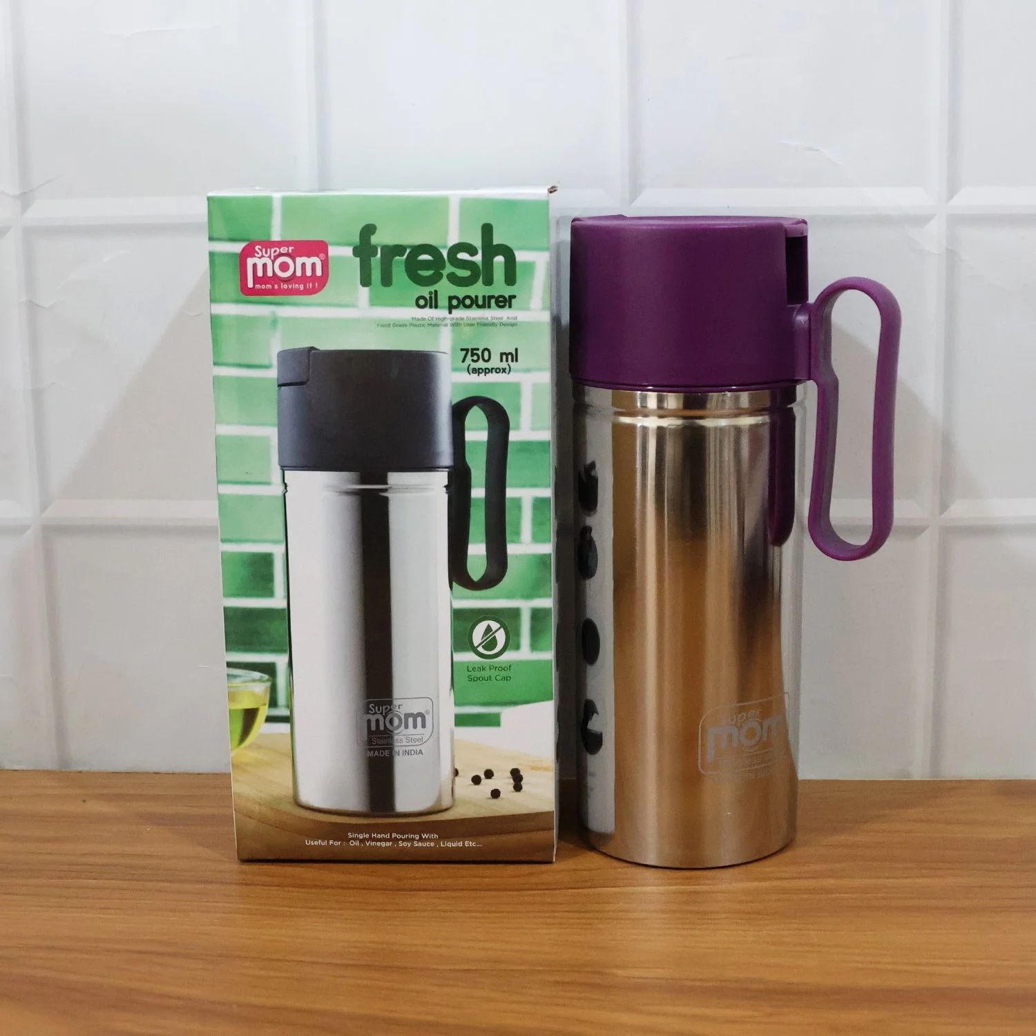 supermom oil pourer, stainless steel oil dispenser, 750ml oil bottle, stainless steel oil can, kitchen oil pourer, anti drip oil dispenser, cooking oil dispenser, vinegar pourer bottle, ghee dispenser, liquid seasoning bottle, steel oil container, easy grip oil pourer, oil dispenser with handle, kitchen oil storage bottle