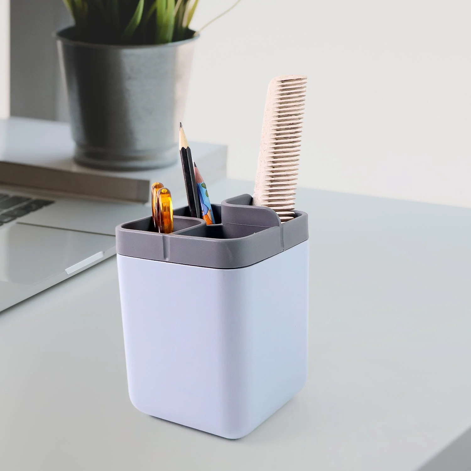 Keep your workspace neat and organized with this Multi-Compartment Utility Holder, designed with four divided sections for sorting and storing small essentials. Whether you're organizing pens and pencils on a desk, makeup brushes on a vanity, or combs and accessories in the bathroom, this durable plastic container offers both convenience and modern style.