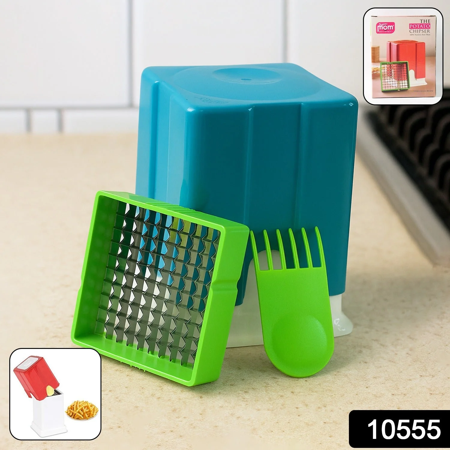 Supermom Potato Chipper Cutter – Stainless Steel French Fry Cutter with Green Handling Frame and Scraper for Home and Kitchen Use