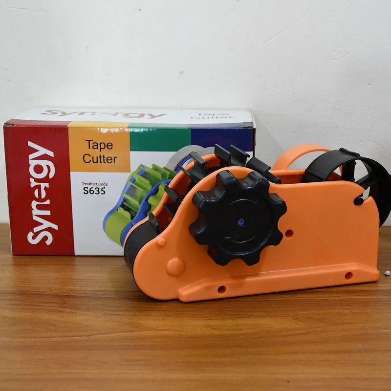 The Synergy Heavy Duty Tape Cutter is a professional-grade packaging tool built for efficiency and durability. Designed with a solid structure and adjustable tension control, it ensures smooth and precise tape cutting for heavy and continuous packaging tasks. Its large side knob allows for quick adjustments, and the dual roller system ensures consistent tape flow. Ideal for both industrial and commercial use, this tape cutter simplifies repetitive sealing work with stability and safety, making it a must-have for warehouses, offices, and dispatch units.