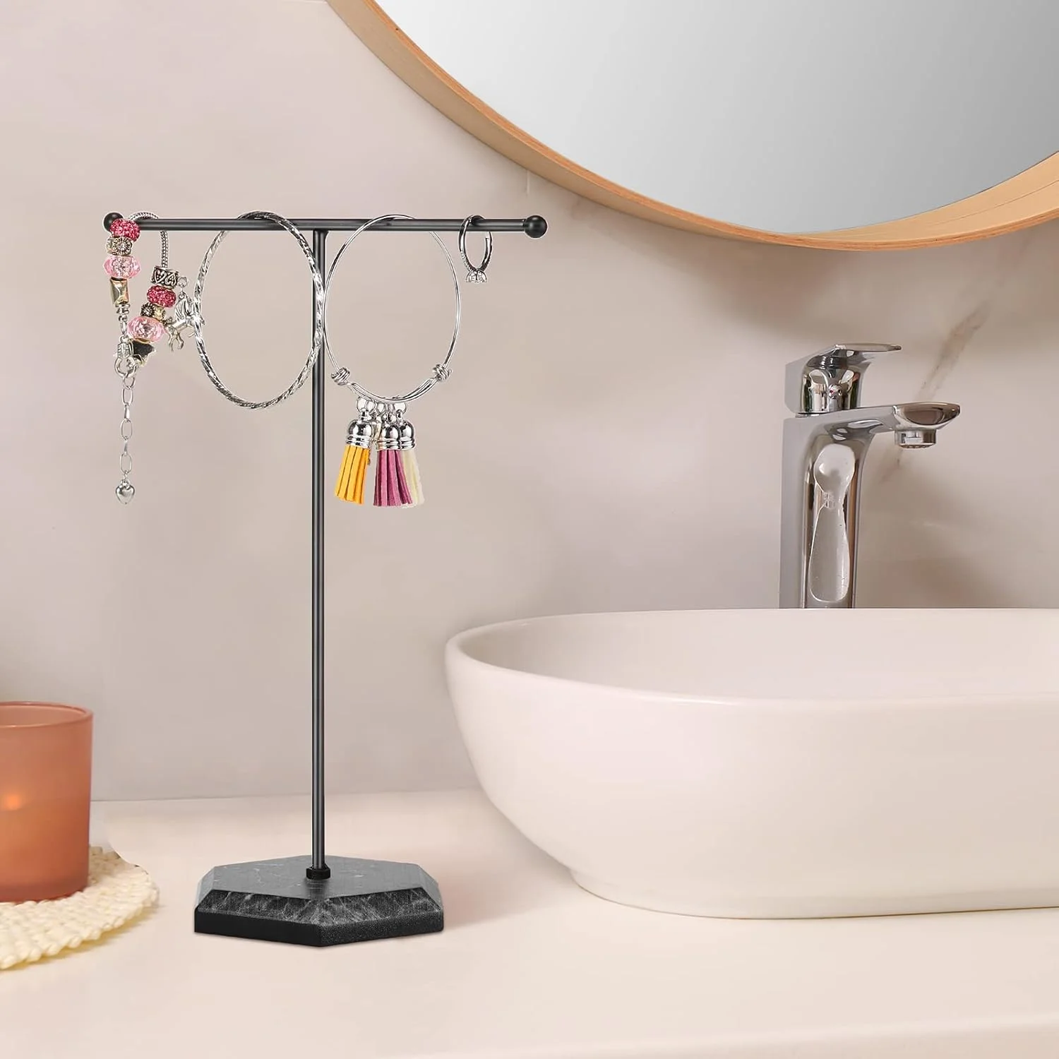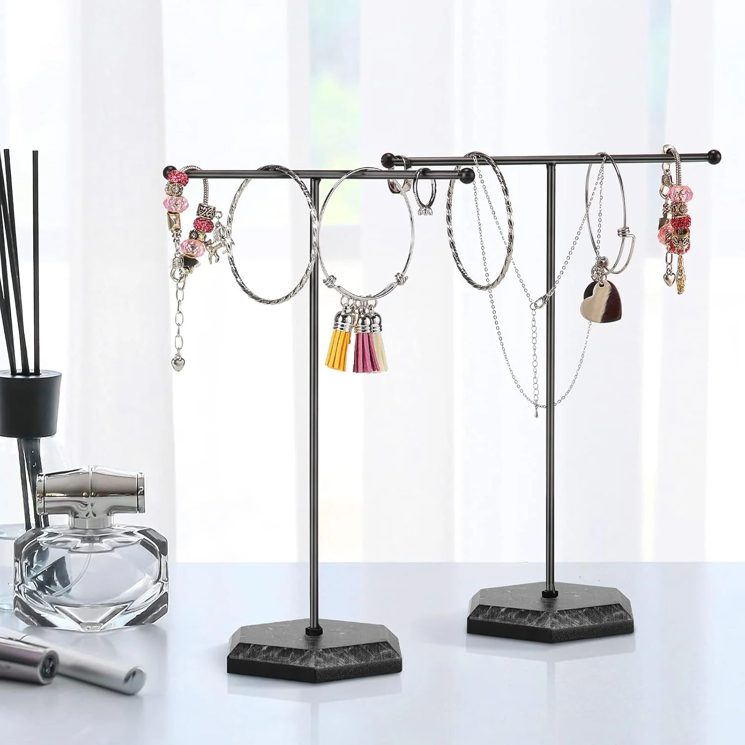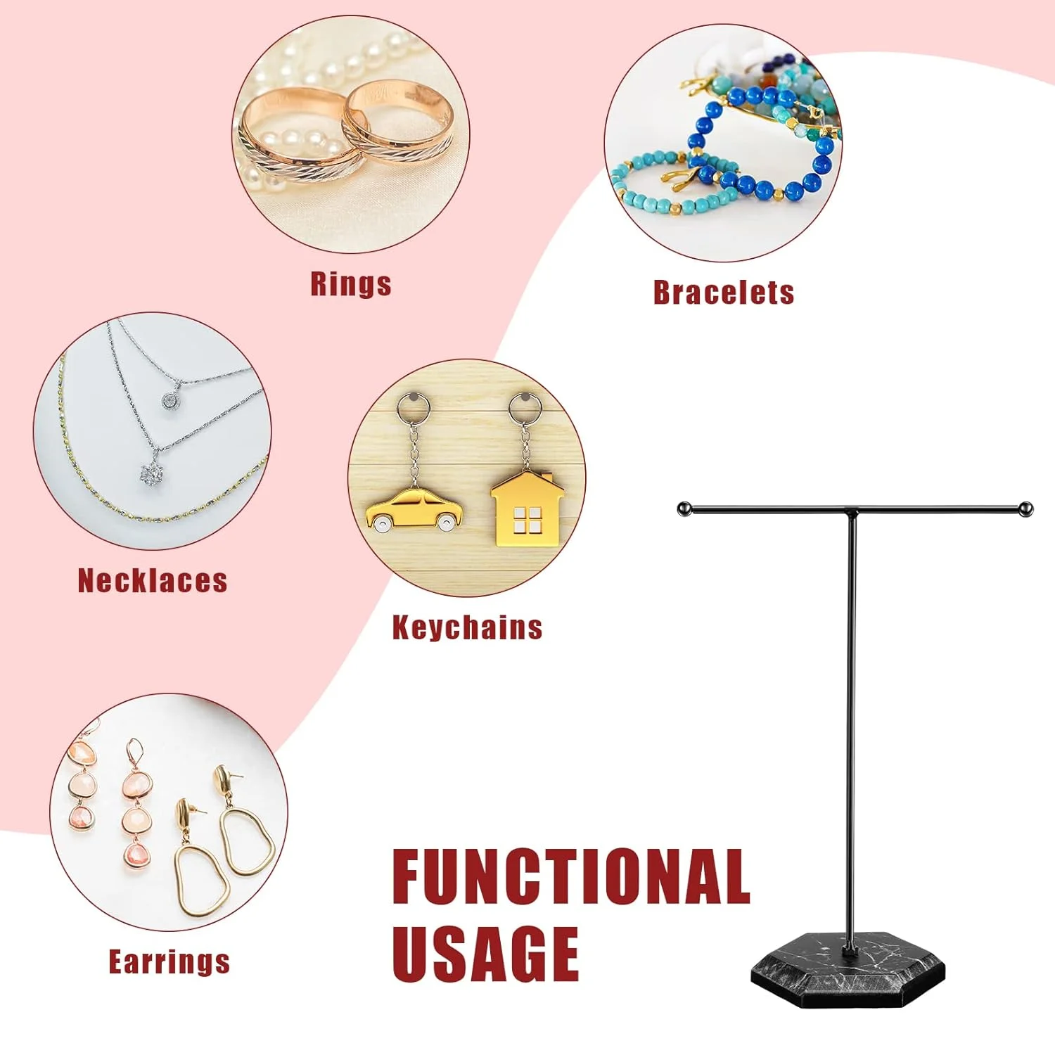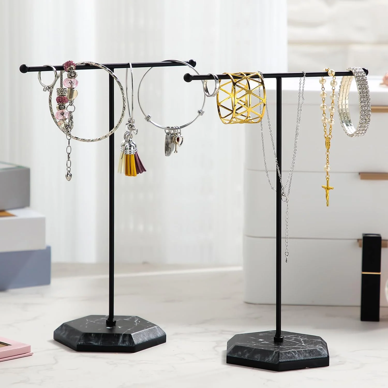 - Sufficient Quantity: 1 sets jewelry organizer stand for you to use and replace, including 1 pieces metal T-Shape Holder and 1 pieces marble plywood bases, satisfying your various needs, you can put them in different places to display your jewelry