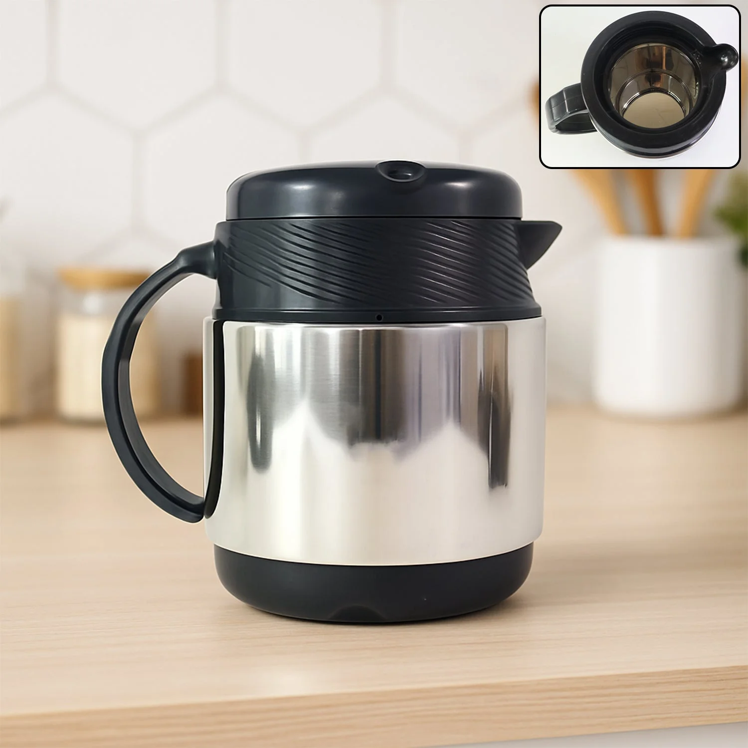 Thermos Feature: Double wall insulation with secure lid and handle