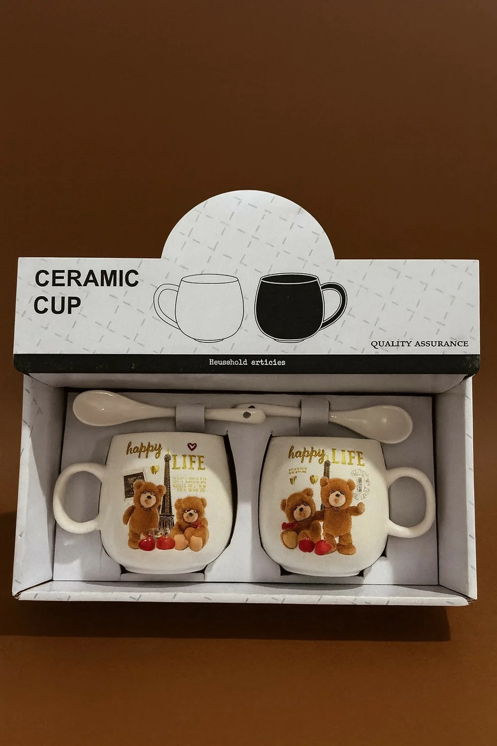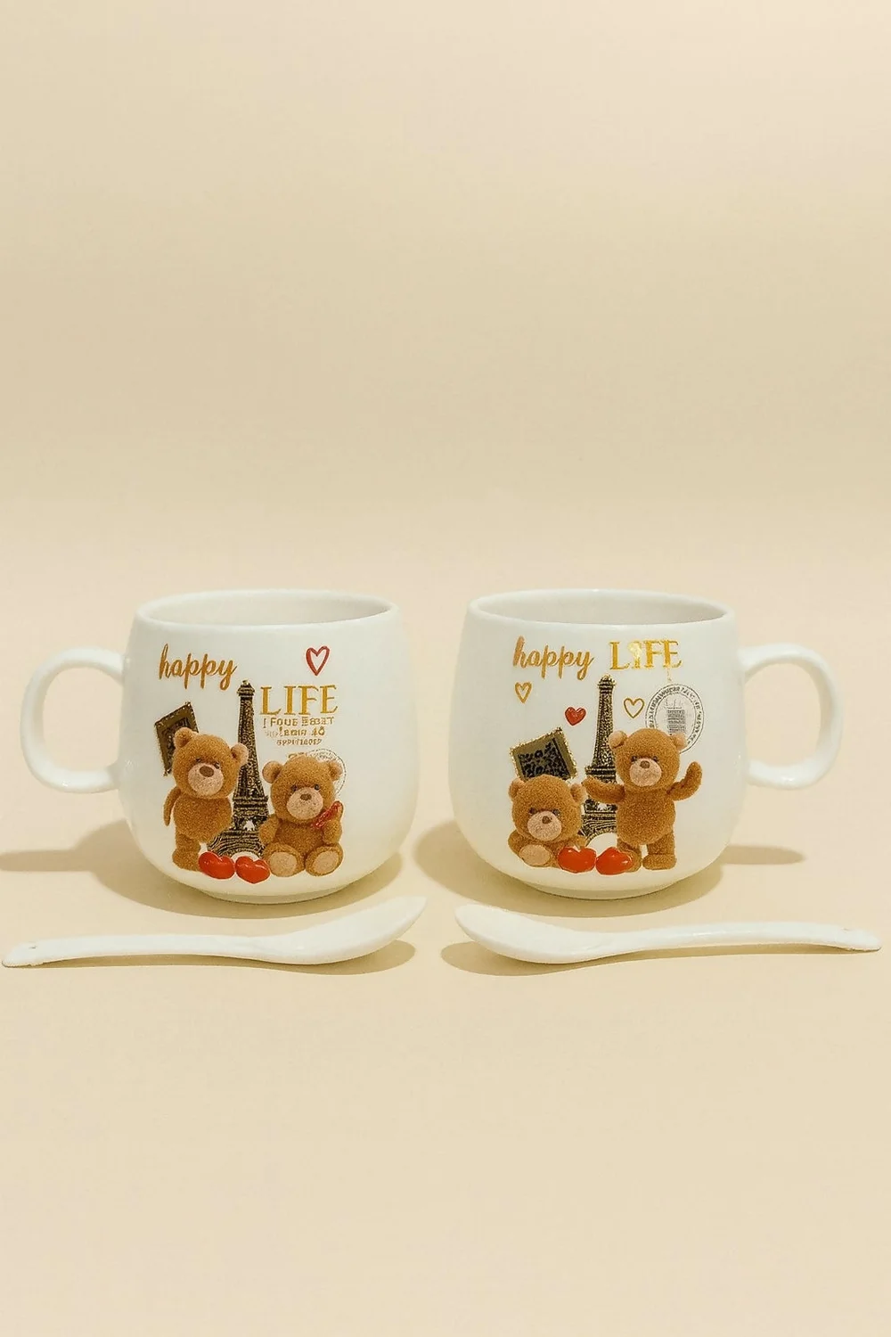 Adorable Teddy Bear Design – Each mug features a cute teddy bear couple with “Happy Life” print.