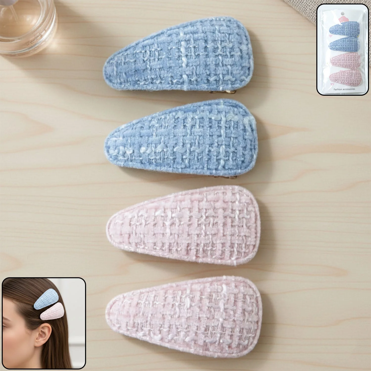textured fabric hair clips, snap hair clip set, soft covered triangle barrettes, hair accessories for women, hair accessories for girls, everyday styling hair clips, makeup hair clips, school hair accessories, casual wear hair clips, lightweight fabric hair clips, decorative hair clip set, stylish hair barrettes, multipurpose hair clips, easy grip snap clips