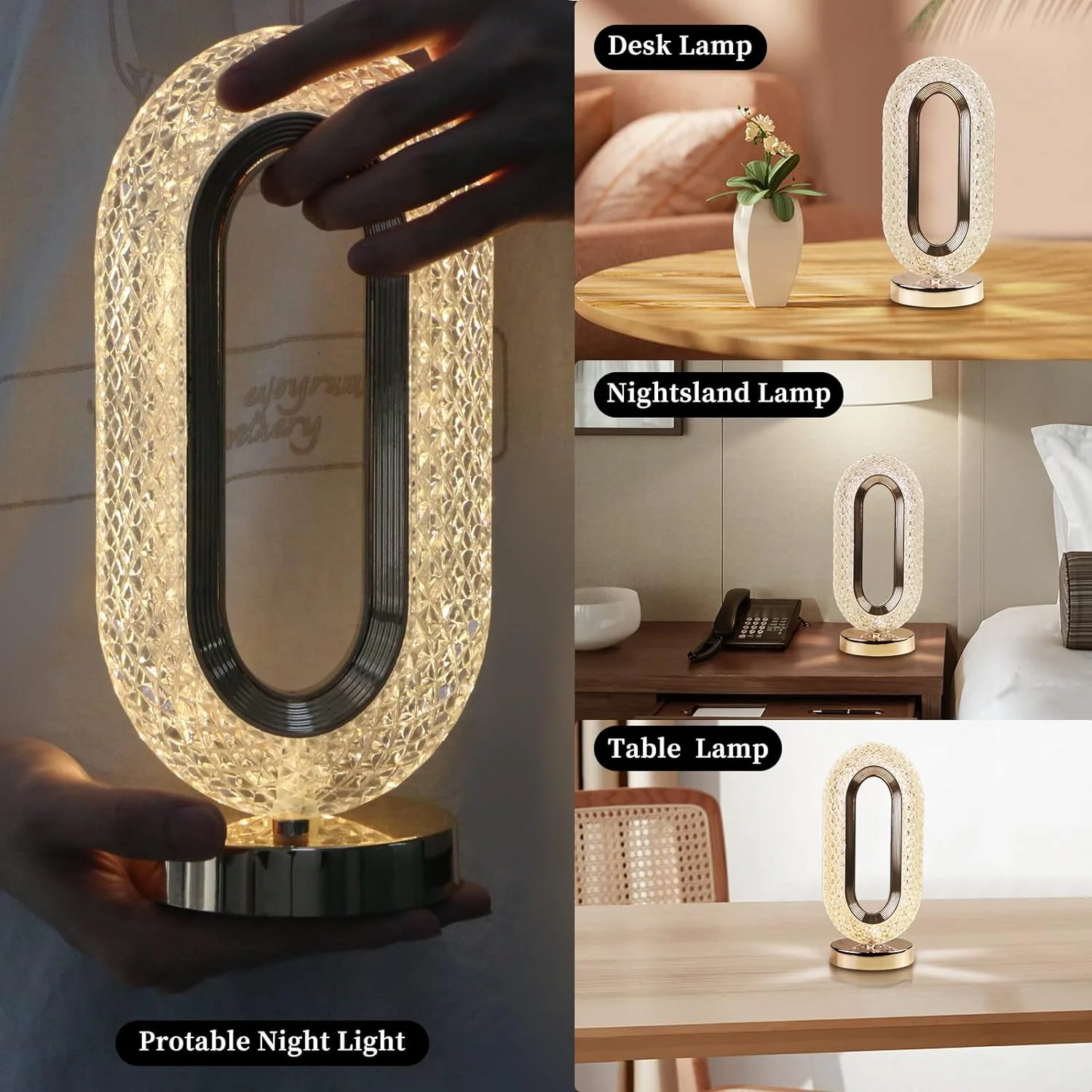 - 【3 Way Dimmable Touch Control Small Table Lamp】:Crystal diamond light with touch control comes in 3 colors (warm white, natural light and cool white),Switch colors with just a short press on the touch controller. In addition to that, the color temperature is adjustable, and a long press of the touch controller button enables the brightness of each color to be adjusted from 5%-100%. Satisfy the decorative effect in different scenes.